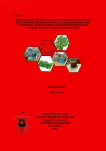 ABSTRAK Alfikar, Karakterisasi Fisis Dan Uji Aktivitas Ekstrak Daun Pepaya Serta Daun Kelor Sebagai Katalisator Dalam Biosintesis Nanoperak: Aplikasi Untuk Agen Fotosentizer Dalam Fotodinamik Inaktivasi Mikroba Pathogen (Dibimbing oleh Dr. Sri Dewi Astuty, Msi, F.med) Latar Belakang. Fotodinamik Inaktivasi (PDI) merupakan metode alternatif non-antibiotik yang memanfaatkan fotosensitizer yang diaktivasi cahaya untuk menghasilkan Reactive Oxygen Species (ROS) yang mampu merusak sel mikroba. Nanoperak (AgNPs) hasil biosintesis tanaman menjadi kandidat fotosensitizer yang menarik karena stabilitas optik dan aktivitas antibakterinya. Ekstrak daun pepaya (Carica papaya) dan daun kelor (Moringa oleifera) mengandung senyawa reduktor serta pigmen klorofil yang mendukung pembentukan AgNPs sekaligus meningkatkan serapan cahaya. Tujuan. Penelitian ini bertujuan mengkarakterisasi sifat optik AgNPs berbasis dua jenis ekstrak daun serta mengevaluasi efektivitasnya dalam PDI terhadap Pseudomonas aeruginosa dan Staphylococcus aureus.Metode. AgNPs disintesis menggunakan ekstrak daun sebagai agen pereduksi larutan AgNO₃. Spektrum absorbansi diukur pada 350–700 nm. Uji aktivitas antibakteri dilakukan menggunakan metode zona hambat. Biofilm dibentuk dalam microplate kemudian diberikan perlakuan laser merah dan laser hijau dengan variasi energi. Viabilitas sel diukur menggunakan metode XTT dan pembacaan Optical Density (OD) pada 490 nm.Hasil. Spektrum UV–Vis menunjukkan terbentuknya puncak Surface Plasmon Resonance (SPR) pada 410–420 nm untuk kedua jenis AgNPs. Uji zona hambat menunjukkan aktivitas antibakteri kuat oleh AgNP–CP dan AgNP–MO. Jalannya fotoinaktivasi menurunkan nilai OD secara signifikan, dengan efektivitas terbaik pada kombinasi L3PS2 untuk P. aeruginosa (0,529) dan S. aureus (0,576). Laser merah memberikan tingkat inaktivasi sedikit lebih tinggi dibanding laser hijau.Kesimpulan. Nanoperak hasil biosintesis ekstrak pepaya dan kelor efektif sebagai fotosensitizer dan mampu meningkatkan proses inaktivasi biofilm melalui mekanisme PDI.