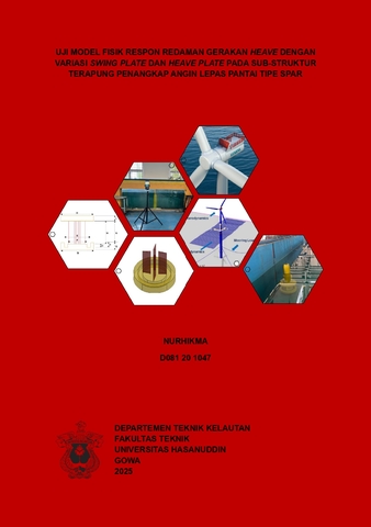 Nurhikma. Uji Model Fisik Respon Dinamis Gerakan Heave Dengan Variasi Swing Plate dan Heave Plate Pada Struktur Terapung Penangkap Angin Lepas Pantai Tipe SPAR. (Dibimbing oleh Sabarudin Rahman) Single Point Anchor Reservoir atau biasa disebut SPAR merupakan salah satu jenis struktur terapung yang biasa digunakan dalam pengembangan industry minyak dan gas yang beroperasi pada laut dalam (ultra-deepwater). Namun, pada penelitian ini berfokus pada SPAR sebagai struktur terapung pembangkit angin lepas pantai (SPAR wind floater). Penelitian ini dilakukan dengan uji model fisik dengan menggunakan metode free decay test skala pengujian 1:115. Tujuan dari penelitian ini ialah untuk mengetahui resposn redaman gerakan heave dengan menambahkan variasi model seperti swing plate dan heave plate. Dari hasil pengujian ini terdapat peningatan redaman gerakan heave pada struktur modifikasi yang telah dilakuan. Hal ini menunjukan bahwa penambahan heave plate pada SPAR dapat meningkatkan redaman yang lebih baik dibandingkan dengan model yang tanpa menggunakan heave plate dan penambahan swing plate juga berpengaruh terhadap redaman gerak heave pada struktur SPAR.