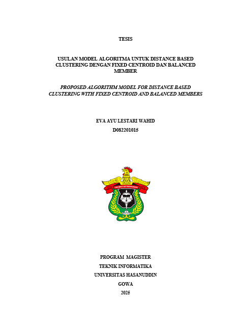 WAHID, EVA AYU LESTARI (2025) USULAN MODEL ALGORITMA UNTUK DISTANCE BASED CLUSTERING DENGAN FIXED CENTROID DAN BALANCED MEMBER = PROPOSED ALGORITHM MODEL FOR DISTANCE BASED CLUSTERING WITH FIXED CENTROID AND BALANCED MEMBERS. Thesis thesis, Universitas Hasanuddin.