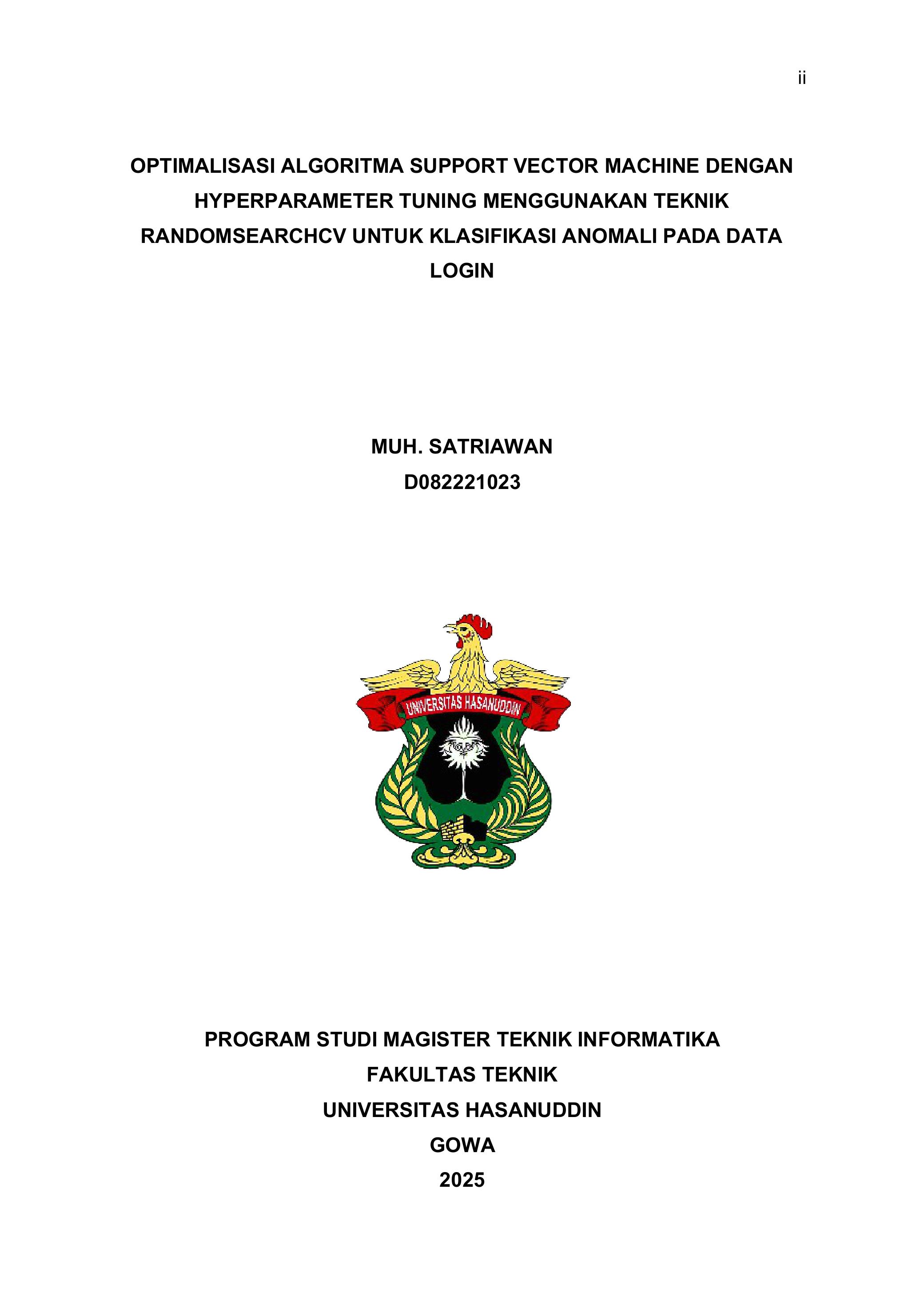 SATRIAWAN, MUH. (2025) OPTIMALISASI ALGORITMA SUPPORT VECTOR MACHINE DENGAN HYPERPARAMETER TUNING MENGGUNAKAN TEKNIK RANDOMSEARCHCV UNTUK KLASIFIKASI ANOMALI PADA DATA LOGIN = OPTIMIZATION OF THE SUPPORT VECTOR MACHINE ALGORITHM USING HYPERPARAMETER TUNING WITH RANDOMSEARCHCV TECHNIQUE FOR ANOMALY CLASSIFICATION IN LOGIN DATA. Thesis thesis, Universitas Hasanuddin.