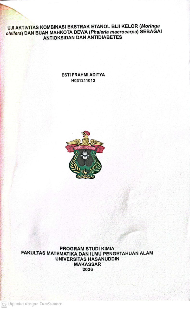 ADITYA, ESTI FRAHMI (2026) Uji Aktivitas Kombinasi Ekstrak Etanol Biji Kelor (Moringa oleifera) dan Buah Mahkota Dewa (Phaleria macrocarpa) sebagai Antioksidan dan Antidiabetes = Study on the Activity of the Combination of Ethanol Extracts of Kelor Seeds (Moringa oleifera) and Mahkota Dewa Fruit (Phaleria macrocarpa) as an Antioxidant and Antidiabetic. Skripsi thesis, Universitas Hasanuddin.