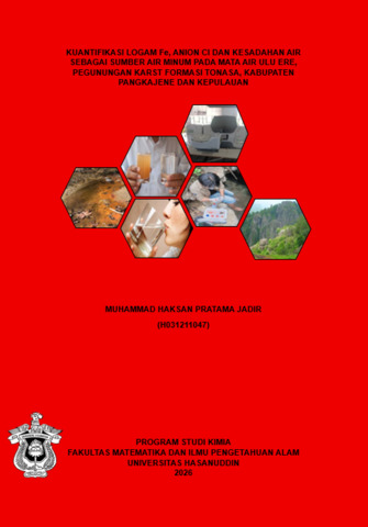 ABSTRAK MUHAMMAD HAKSAN PRATAMA JADIR. Kuantifikasi Logam Fe, Anion Cl dan Kesadahan Air Sebagai Sumber Air Minum Pada Mata Air Ulu Ere, Pegunungan Karst Formasi Tonasa, Kabupaten Pangkajene dan Kepulauan (dibimbing oleh Abd Wahid Wahab) Latar Belakang. Mata Air Ulu Ere yang terletak di Pegunungan Karst Formasi Tonasa merupakan salah satu sumber utama air bersih masyarakat yang dimanfaatkan untuk kebutuhan rumah tangga, pertanian, dan wisata. Kondisi batuan karbonat (karst) serta aktivitas masyarakat di sekitar lokasi berpotensi memengaruhi kandungan logam dalam air, terutama logam besi (Fe), magnesium (Mg), kalsium (Ca) dan klorida (Cl). Tujuan. Penelitian ini bertujuan untuk menguantifikasi kadar logam Fe, anion Cl dan kesadahan air pada sampel air dari Mata Air Ulu Ere dan menilai kualitasnya berdasarkan Permenkes RI Nomor 2 Tahun 2023 tentang Standar Baku Mutu Kesehatan Lingkungan untuk Parameter Wajib Air Minum dan Pergub Sulsel Nomor 69 Tahun 2010 tentang Baku Mutu dan Kriteria Kerusakan Lingkungan Hidup. Metode. Analisis kadar Fe dan kesadahan air dilakukan menggunakan Atomic Absorption Spectrophotometer (AAS), sedangkan anion Cl⁻ dianalisis dengan metode Argentometri. Hasil. Hasil penelitian menunjukkan kadar Fe berkisar antara 0,0357–0,1266 mg/L, kesadahan total yang diperoleh berkisar antara 104,60–126,01 mg/L, sedangkan kadar klorida (Cl⁻) berkisar 25,57-31,47 mg/L. Seluruh parameter tersebut masih memenuhi persyaratan kualitas air minum sesuai standar yang berlaku. Dengan demikian, parameter uji air yang dilakukan di Mata Air Ulu Ere dikategorikan layak sebagai sumber air bersih dan aman untuk dikonsumsi.