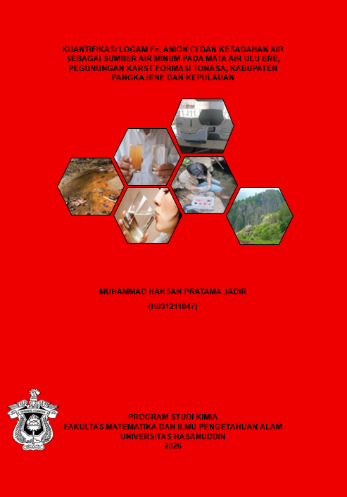 JADIR, MUHAMMAD HAKSAN PRATAMA (2026) Kuantifikasi Logam Fe, Anion Cl dan Kesadahan Air Sebagai Sumber Air Minum Pada Mata Air Ulu Ere, Pegunungan Karst Formasi Tonasa, Kabupaten Pangkajene dan Kepulauan = Quantification of Fe, Chloride Anion, and Water Hardness as a Source of Drinking Water in Ulu Ere Spring, Karst Highlands of the Tonasa Formation, Kabupaten Pangkajene dan Kepulauan. Skripsi thesis, Universitas Hasanuddin.
