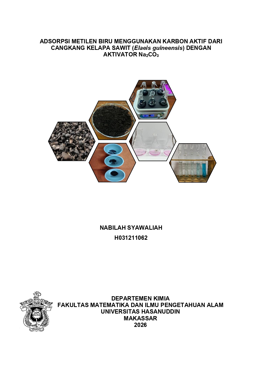 SYAWALIAH, NABILAH (2026) ADSORPSI METILEN BIRU MENGGUNAKAN KARBON AKTIF DARI CANGKANG KELAPA SAWIT (Elaeis guineensis) DENGAN AKTIVATOR Na2CO3 = ADSORPTION OF BLUE METHYLENE USING ACTIVATED CARBON FROM PALM OIL SHELLS (Elaeis guineensis) WITH Na2CO3 ACTIVATOR. Skripsi thesis, Universitas Hasanuddin.