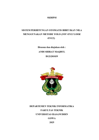 MAQBUL, ANDI SHIRAT (2025) SISTEM PERHITUNGAN OTOMATIS BIBIT IKAN NILA MENGGUNAKAN METODE YOLO (YOU ONLY LOOK ONCE) = AUTOMATIC CALCULATION SYSTEM OF TILAPIA FINGERLINGS USING YOLO METHOD (YOU ONLY LOOK ONCE). Skripsi thesis, Universitas Hasanuddin.