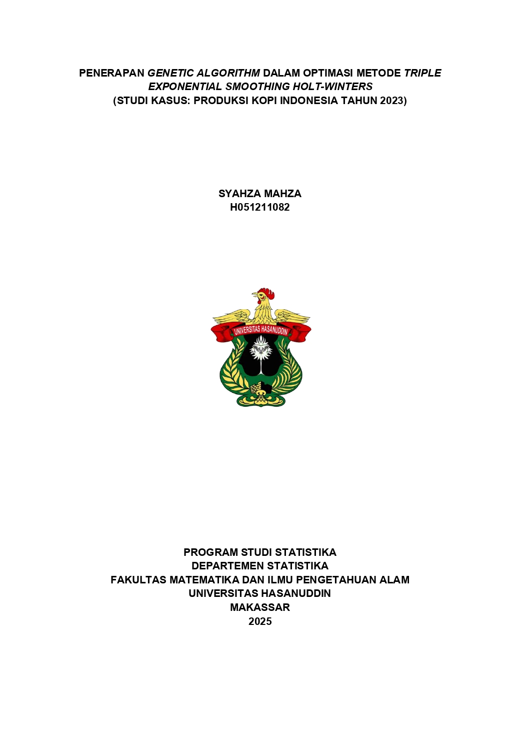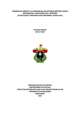 MAHZA, SYAHZA (2025) Penerapan Genetic Algorithm Dalam Optimasi Metode Triple Exponential Smoothing Holt-Winters (Studi Kasus: Produksi Kopi Indonesia Tahun 2023) = Application of Genetic Algorithm in Optimizing the Holt–Winters Triple Exponential Smoothing Method (A Case Study: Indonesian Coffee Production in 2023). Skripsi thesis, Universitas Hasanuddin.