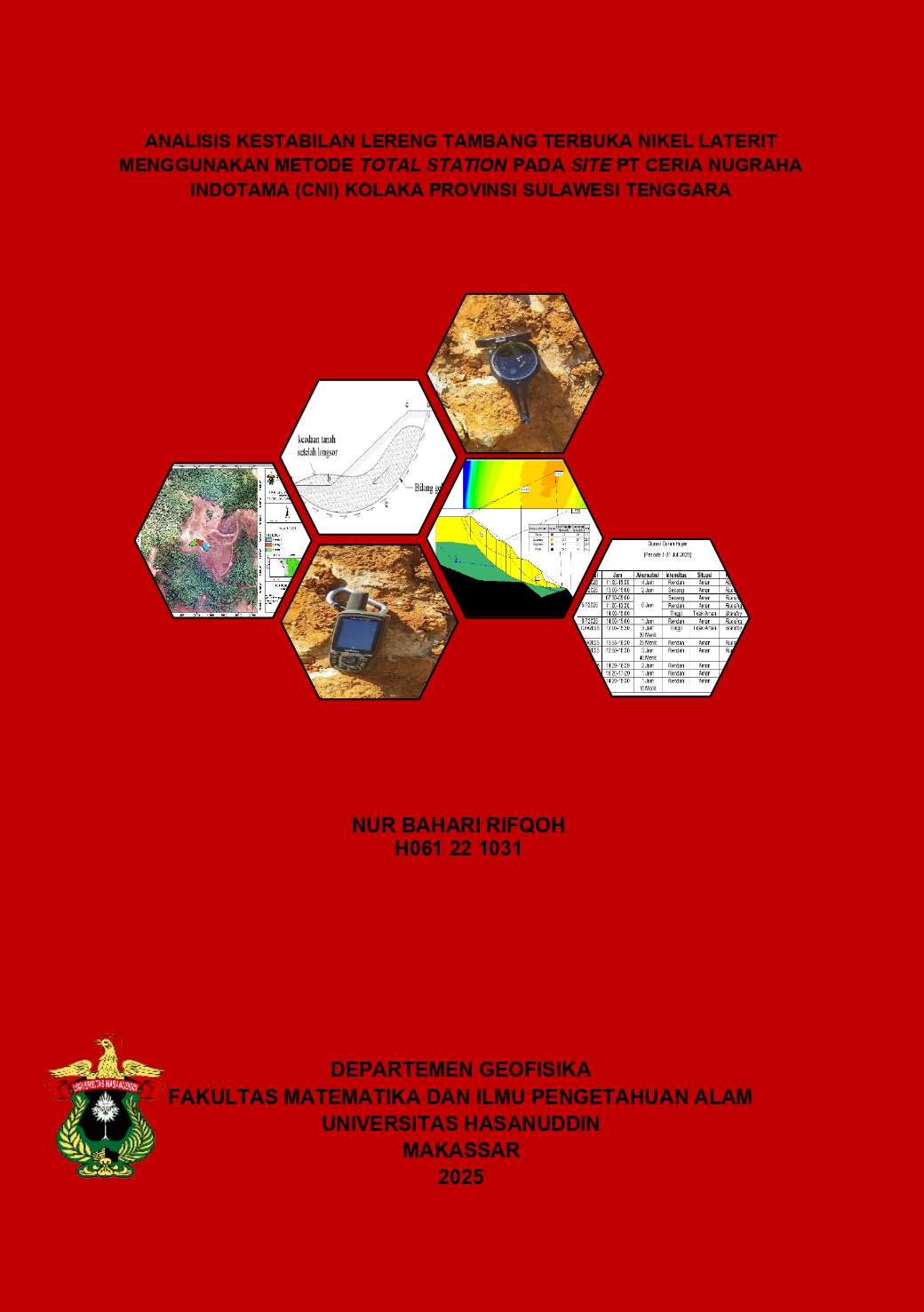 RIFQOH, NUR BAHARI (2025) Analisis Kestabilan Lereng Tambang Terbuka Nikel Laterit Menggunakan Metode Total Station Pada Site PT Ceria Nugraha Indotama (CNI) Kolaka Provinsi Sulawesi Tenggara = Slope Stability Analysis of a Nickel Laterite Open-pit Mine Using the Total Station Method at the PT Ceria Nugraha Indotama (CNI) Kolaka Site, Southeast Sulawesi Province. Skripsi thesis, Universitas Hasanuddin.