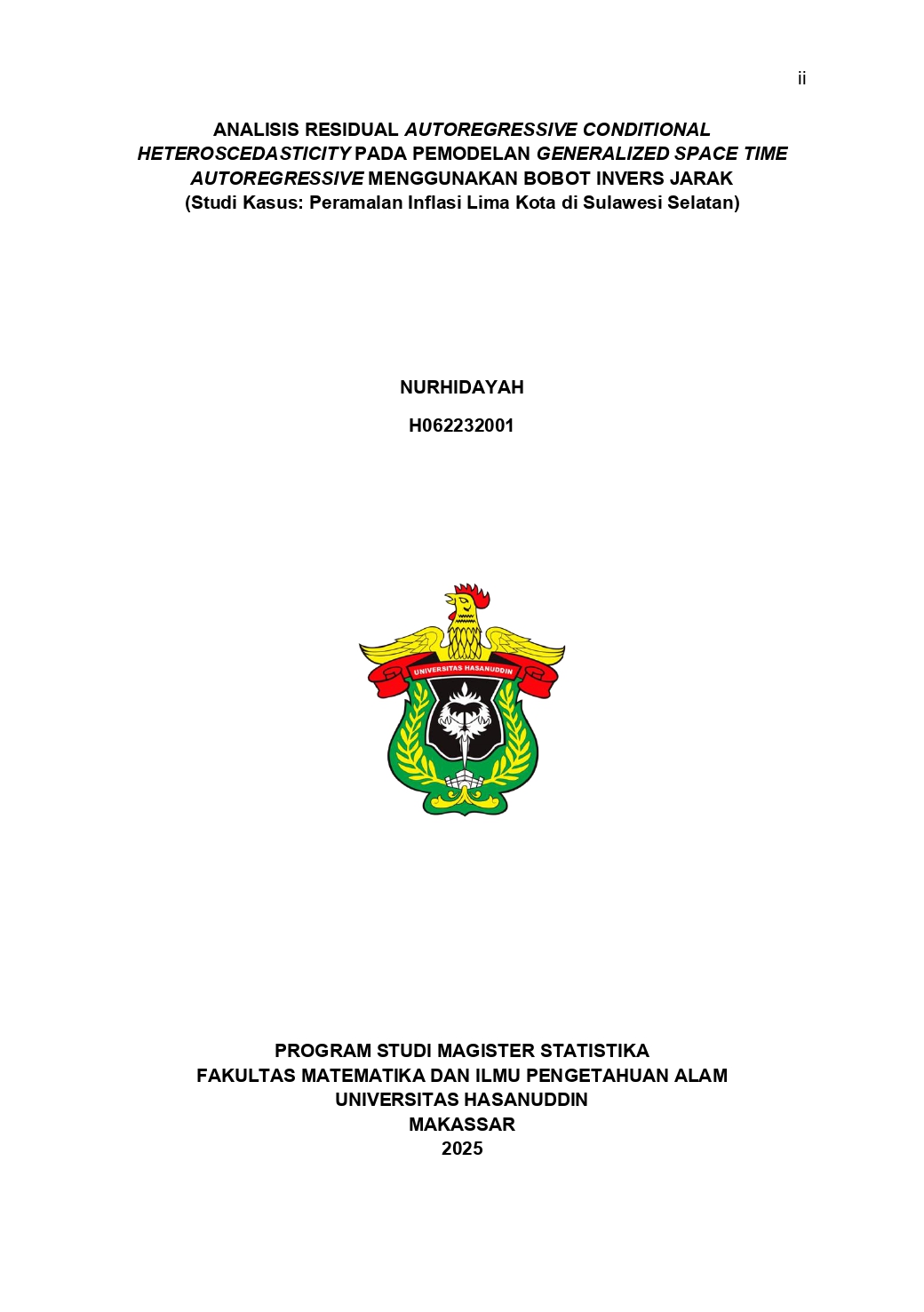 NURHIDAYAH, NURHIDAYAH (2025) ANALISIS RESIDUAL AUTOREGRESSIVE CONDITIONAL HETEROSCEDASTICITY PADA PEMODELAN GENERALIZED SPACE TIME AUTOREGRESSIVE MENGGUNAKAN BOBOT INVERS JARAK (Studi Kasus: Peramalan Inflasi Lima Kota di Sulawesi Selatan) = ANALYSIS OF AUTOREGRESSIVE CONDITIONAL HETEROSCEDASTICITY RESIDUALS IN THE GENERALIZED SPACE TIME AUTOREGRESSIVE MODEL USING INVERSE DISTANCE WEIGHTS (Case Study: Inflation Forecasting in Five Cities of South Sulawesi). Thesis thesis, Universitas Hasanuddin.