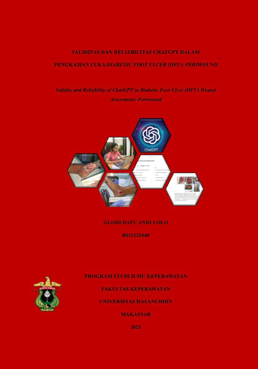 Glori Datu Andi Lolo. R011221040. VALIDITAS DAN RELIABILITAS CHATGPT DALAM PENGKAJIAN LUKA DIABETIC FOOT ULCER (DFU): PERIWOUND, dibimbing oleh Saldy Yusuf, S.Kep., Ns., MHS., Ph.D Latar Belakang: DFU merupakan masalah kesehatan masyarakat yang terus meningkat, seiring dengan meningkatnya kejadian diabetes. Meskipun pencegahan merupakan pengobatan yang paling efektif untuk DFU, tantangan tetap terletak pada pemilihan pengobatan optimal pada kasus DFU. Ilmu kesehatan telah banyak diuntungkan dari integrasi aplikasi kecerdasan buatan (AI) di berbagai bidang. Mengenai pengkajian DFU, baik literatur maupun praktik klinis sebagian besar berfokus pada strategi untuk mencegah pengkajian DFU dan mengidentifikasi faktor risiko yang dapat dihindari. Namun, data tentang parameter/alat bantu yang dapat digunakan untuk menentukan tingkat amputasi sangat terbatas. Studi ini meneliti reliabilitas dan validitas ChatGPT dalam pengkajian luka kaki diabets. Tujuan: Menilai kemampuan ChatGPT sebagai alat bantu dalam pengkajian DFU pada area periwound, dengan fokus pada validitas dan reliabilitas penilaian. Metode: Menggunakan 60 foto DFU untuk menilai validitas dan reliabilitas ChatGPT dalam pengkajian luka menggunakan BWAT, DMIST, dan DFUAS. Validitas diuji dengan membandingkan penilaian ChatGPT dan perawat expert, sedangkan reliabilitas diuji dengan membandingkan penilaian ChatGPT antar device, dengan tahapan ChatGPT diinduksi dengan instrumen kemudian dibuatkan kalimat prompt, upload foto yang akan dibaca oleh ChatGPT dengan keluaran berbentuk tabel sesuai penilaian instrumen. Kinerja dinilai berdasarkan kesepakatan dan konsistensi menggunakan Cohen’s kappa dan Fleiss’ kappa. Hasil: Hasil uji validitas ChatGPT vs Perawat Expert dan reliabilitas ChatGPT vs ChatGPT menunjukkan tingkat konsistensi dan kesepakatan yang rendah. ChatGPT menunjukan ChatGPT kesulitan menangani kasus kompleks, yang menunjukkan keterbatasan ChatGPT dalam menangani karakteristik luka yang lebih menantang. Kesimpulan dan saran: Hasil uji validitas ChatGPT vs Perawat Expert dan reliabilitas ChatGPT vs ChatGPT menunjukkan tingkat konsistensi dan kesepakatan yang rendah. Sehingga ChatGPT belum dapat dinyatakan valid dan reliabel. Meskipun demikian, ChatGPT digunakan sebagai alat bantu pendukung dalam pengkajian.