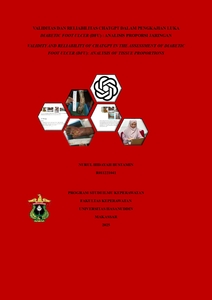Nurul Hidayah Bustamin. R011221041. VALIDITAS DAN RELIABILITAS CHATGPT DALAM PENGKAJIAN LUKA DIABETIC FOOT ULCER (DFU) : ANALISIS PROPORSI JARINGAN, dibimbing oleh Saldy Yusuf, S.Kep., Ns., MHS., Ph.D Latar Belakang : Pengkajian luka kaki diabetes (Diabetic Foot Ulcer/DFU) merupakan langkah krusial dalam menentukan intervensi perawatan yang tepat, terutama dalam menilai proporsi jaringan luka. Namun, penilaian ini masih bersifat subjektif dan bergantung pada pengalaman klinisi. Perkembangan kecerdasan buatan, khususnya ChatGPT, membuka peluang pemanfaatan teknologi sebagai alat bantu pengkajian luka berbasis foto, sehingga diperlukan evaluasi validitas dan reliabilitasnya Tujuan : Untuk menilai validitas ChatGPT dibandingkan perawat ahli serta reliabilitas ChatGPT antar perangkat dalam menentukan proporsi jaringan luka DFU menggunakan foto luka. Metode : Penelitian kuantitatif dengan desain komparatif-observasional menggunakan 60 foto luka kaki diabetes dari Klinik Griya Afiat Makassar. Penilaian proporsi jaringan (granulasi, slough, nekrotik, dan epitel) dilakukan oleh perawat ahli dan ChatGPT menggunakan instrumen DFUAS, BWAT, dan DMIST. Uji validitas dianalisis dengan Cohen’s kappa (ChatGPT vs expert), sedangkan uji reliabilitas dianalisis menggunakan Cohen’s kappa dan Fleiss’ kappa (ChatGPT vs ChatGPT antar device). Hasil : Uji validitas menunjukkan tingkat kesepakatan moderat hingga kuat antara ChatGPT dan perawat ahli pada seluruh instrumen, dengan nilai kappa tertinggi pada penilaian proporsi jaringan nekrotik dan DMIST. Uji reliabilitas antar device menunjukkan kesepakatan moderat hingga kuat berdasarkan Cohen’s kappa, namun cenderung lebih rendah berdasarkan Fleiss’ kappa, yang menandakan adanya variasi konsistensi penilaian antar perangkat. Kesimpulan dan saran : ChatGPT memiliki validitas yang cukup hingga kuat dalam menentukan proporsi jaringan luka DFU dibandingkan perawat ahli, namun reliabilitas antar perangkat masih bervariasi. ChatGPT berpotensi digunakan sebagai alat bantu pendukung pengkajian luka, tetapi belum dapat menggantikan penilaian klinis perawat. Diperlukan pengembangan model standardisasi penggunaan untuk meningkatkan konsistensi hasil. Kata Kunci : ChatGPT, Pengkajian Luka, Validitas, Reliabilitas, Proporsi Jaringan