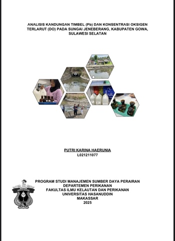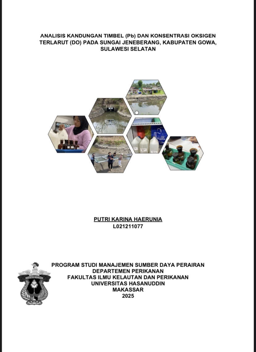 HAERUNIA, PUTRI KARINA (2025) Analisis Kandungan Timbel (Pb) dan Konsentrasi Oksigen Terlarut (DO) pada Sungai Jeneberang, Kabupaten Gowa, Sulawesi Selatan = Analysis of Lead (Pb) Content and Dissolved Oxygen (DO) Concentration in the Jeneberang River, Gowa Regency, South Sulawesi. Skripsi thesis, universitas hasanudddin.