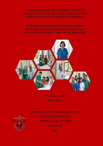 ANSAR, FAUZIYA (2025) Gambaran Pengetahuan Perawat Tentang Discharge Planning Pada Pasien Stroke di Unit Perawatan Non Jiwa RSKD Dadi Makassar = An Overview of Nurses' Knowledge About Discharge Planning for Stroke Patients in The Non-Psychiatric Care Unit of RSKD Dadi Makassar. Skripsi thesis, Universitas Hasanuddin.