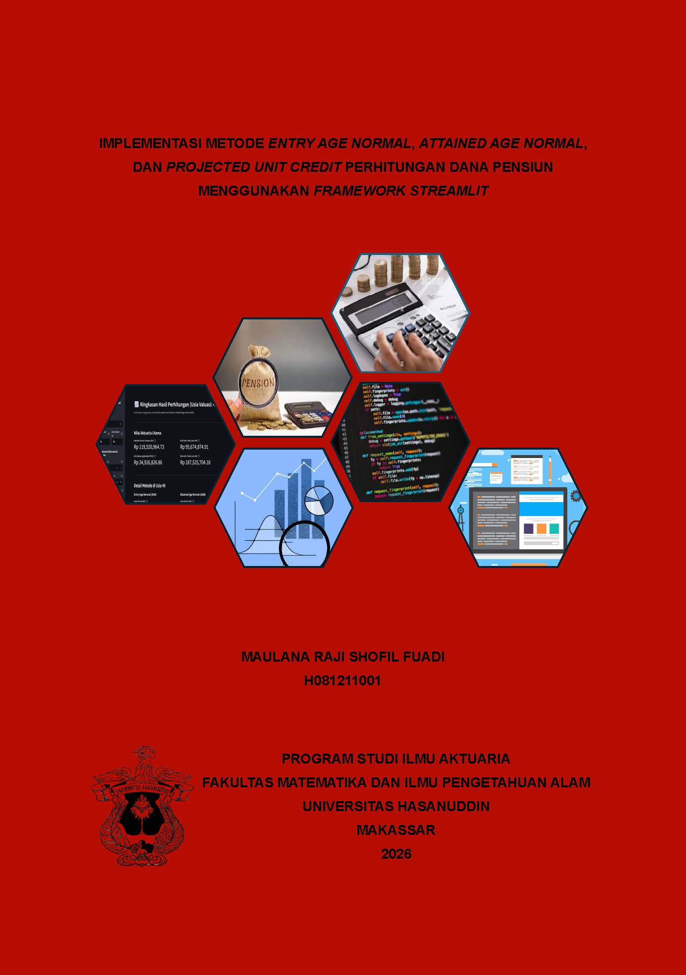FUADI, MAULANA RAJI SHOFIL (2026) Implementasi Metode Entry Age Normal, Attained Age Normal, dan Projected Unit Credit Perhitungan Dana Pensiun menggunakan Framework Streamlit = Implementation of the Entry Age Normal, Attained Age Normal, and Projected Unit Credit Methods for Retirement Fund Calculation Using the Streamlit Framework. Skripsi thesis, Universitas Hasanuddin.