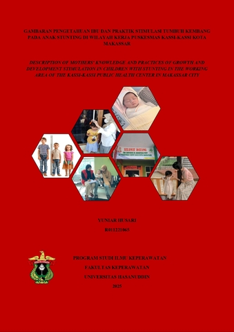 Yuniar Husari. R011221065. Overview of Mothers' Knowledge and Practices of Growth and Development Stimulation for Stunted Children in the Kassi-Kassi Community Health Center Work Area, Makassar City, supervised by Kadek Ayu Erika. Background. Stunting is a condition of growth failure in toddlers due to chronic malnutrition and repeated infections. One important factor in preventing and overcoming stunting is providing optimal growth and development stimulation from an early age to support child development. Mothers' knowledge regarding how to provide age-appropriate stimulation is lacking. Growth and development stimulation in children, which encompasses several aspects, plays a crucial role in helping children reach their full potential, and not all mothers understand the appropriate method. Objective: To describe mothers' knowledge regarding child growth and development and the stimulation provided to children in the Kassi-Kassi Community Health Center work area. Method: The study used a quantitative descriptive design with a cross-sectional approach. A sample of 214 mothers with stunted children aged 0–5 years was selected using consecutive sampling. Data were collected through a knowledge questionnaire (α=0.827) and analyzed univariately using frequency distribution and percentages. Results: Most respondents had good knowledge (94.4%) and adequate stimulation practices (82.6%). These results indicate that high maternal knowledge contributes to optimal growth and development stimulation practices for stunted children. Conclusion: The maternal knowledge in the Kassi-Kassi Community Health Center (Puskesmas) work area is relatively good and in line with optimal growth and development stimulation practices, although some stimulation practices are still lacking. Continuous education is still needed to maintain consistency and improve the quality of stimulation for stunted children.