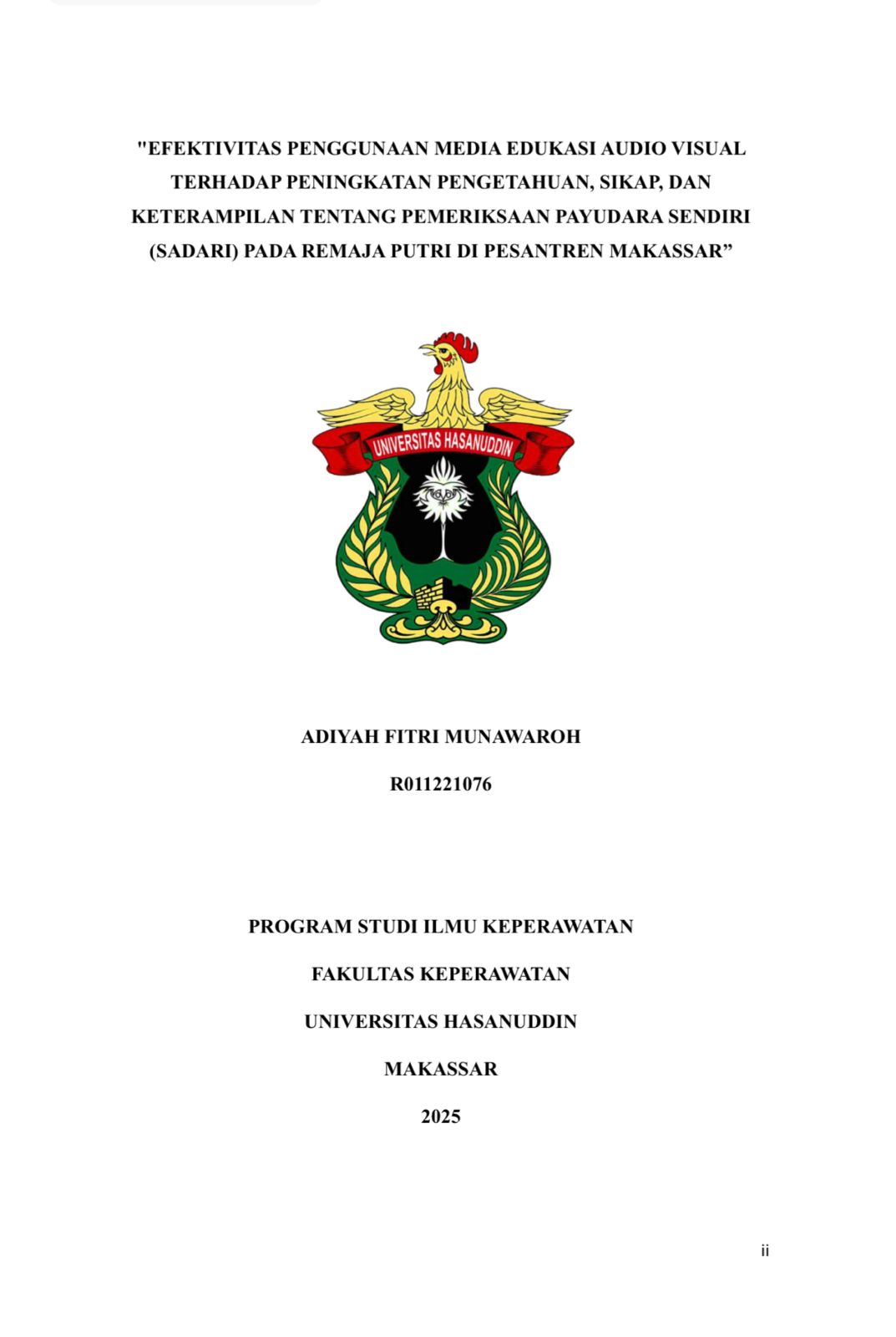 Adiyah Fitri Munawaroh R011221076. EFEKTIVITAS PENGGUNAAN MEDIA EDUKASI AUDIO VISUAL TERHADAP PENINGKATAN PENGETAHUAN, SIKAP, DAN KETERAMPILAN TENTANG PEMERIKSAAN PAYUDARA SENDIRI (SADARI) PADA REMAJA PUTRI DI PESANTREN MAKASSAR, dibimbing oleh Arnis Puspitha R., S.Kep, Ns., M.Kes. Latar Belakang: Kanker payudara masih menjadi salah satu penyakit dengan prevalensi tinggi pada perempuan. Oleh karena itu, deteksi dini seperti Pemeriksaan Payudara Sendiri (SADARI) merupakan langkah penting dalam upaya pencegahan. Di lingkungan pesantren, pengetahuan dan keterampilan remaja putri tentang SADARI sering kali belum memadai akibat keterbatasan informasi kesehatan. Media edukasi audio visual dinilai mampu membantu meningkatkan literasi kesehatan karena memberikan penyampaian materi yang lebih menarik, konkret, serta mudah dipahami. Tujuan: Mengetahui efektivitas media edukasi audio visual terhadap peningkatan pengetahuan, sikap, dan keterampilan remaja putri di pesantren makassar mengenai pemeriksaan payudara sendiri (SADARI) sebagai upaya deteksi dini kanker payudara. Metode: Penelitian menggunakan desain pre-experimental model one group pretest-posttest dengan sampel 80 remaja putri yang dipilih melalui total sampling. Instrumen penelitian berupa kuesioner dan lembar observasi. Analisis data dilakukan dengan uji Wilcoxon pada tingkat signifikansi p < 0,05. Hasil: Hasil keseluruhan menunjuk kan bahwa media edukasi audio visual terbukti efektif dalam meningkatkan pengetahuan, sikap, keterampilan. Nilai rata-rata pengetahuan meningkat dari 40,56 menjadi 89,93; sikap dari 68,42 menjadi 83,53; serta keterampilan dari 34,26 menjadi 94,70 (seluruhnya p = 0,000). Seluruh responden (100%) mengalami peningkatan pada ketiga aspek. Simpulan: Media edukasi audio visual terbukti efektif dalam meningkatkan pengetahuan, sikap, dan keterampilan remaja putri mengenai SADARI. Pendekatan ini layak digunakan sebagai strategi promosi kesehatan di sekolah maupun pesantren. Kata Kunci: edukasi audio visual, SADARI, pengetahuan, sikap, keterampilan, remaja putri.