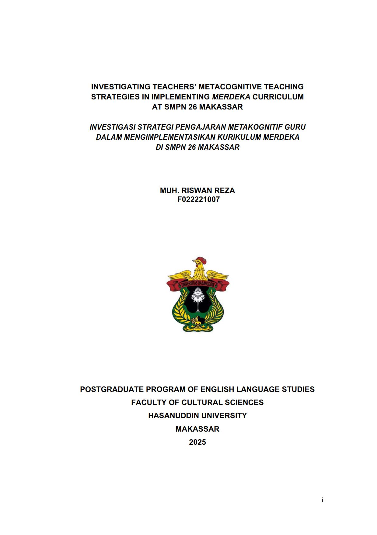 REZA, MUH. RISWAN (2025) Investigasi Strategi Pengajaran Metakognitif Guru dalam Mengimplementasikan Kurikulum Merdeka Di SMPN 26 Makassar = Investigating Teachers’ Metacognitive Teaching Strategies In Implementing Merdeka Curriculum at SMPN 26 Makassar. Thesis thesis, Universitas Hasanuddin.