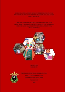 Selvianti. R011221131. Hubungan Pola Tidur dengan Perkembangan Anak Usia Prasekolah di Wilayah Kerja Puskesmas Kassi-Kassi Kota Makassar, dibimbing oleh Dr. Karmila Sarih, S.Kep., M.Kes. Latar Belakang. Pola tidur berperan penting dalam pematangan sistem saraf dan perkembangan anak usia prasekolah, sehingga gangguan tidur dapat berdampak pada fungsi motorik, bahasa, kognitif, dan perilaku. Kondisi ini relevan dengan temuan di Puskesmas Kassi-Kassi Kota Makassar, di mana masih terdapat anak dengan perkembangan meragukan hingga menyimpang. Tujuan. Mengetahui gambaran pola tidur, perkembangan anak, serta hubungan keduanya pada anak usia prasekolah. Metode. Penelitian kuantitatif dengan desain cross sectional pada 261 anak prasekolah. Pola tidur diukur menggunakan Children Sleep Habit Questionnaire (CSHQ), sedangkan perkembangan anak dinilai menggunakan Kuesioner Pra-Skrining Perkembangan (KPSP). Analisis hubungan dilakukan menggunakan uji Chi-square dengan tingkat signifikansi p<0,05 dan dilengkapi nilai korelasi. Hasil. Sebanyak 141 anak (54%) memiliki pola tidur normal, sedangkan 120 anak (46%) mengalami gangguan pola tidur. Perkembangan anak menunjukkan 191 anak (73,2%) sesuai umur, 67 anak (25,7%) meragukan, dan 3 anak (1,1%) menyimpang. Terdapat hubungan signifikan antara pola tidur dan perkembangan anak (p < 0,001) dengan kekuatan korelasi Cramer’s V = 0,704, yang menunjukkan hubungan yang kuat. Kesimpulan. Pola tidur memiliki hubungan yang signifikan dengan perkembangan anak prasekolah, di mana anak dengan pola tidur normal lebih cenderung menunjukkan perkembangan yang sesuai dibandingkan anak dengan gangguan tidur. Kata Kunci: pola tidur, perkembangan anak, prasekolah, KPSP, CSHQ