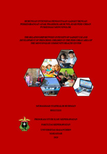 ABSTRAK MUHAMMAD SYAFRIALDI BUDIMAN Hubungan Intensitas Penggunaan Gadget dengan Perkembangan Anak Prasekolah di Wilayah Peri-Urban Puskesmas Moncongloe. (dibimbing oleh Karmila Sarih) Latar Belakang: Anak usia prasekolah berada pada masa perkembangan pesat yang membutuhkan stimulasi yang tepat untuk mendukung perkembangan motorik kasar, motorik halus, bahasa dan bicara, serta sosialisasi dan kemandirian pada anak. Namun, semakin mudahnya akses gadget di lingkungan keluarga, terutama di wilayah peri-urban, menyebabkan anak sering menggunakan gadget dalam durasi dan frekuensi tinggi. Penggunaan gadget yang berlebihan dapat mengurangi aktivitas bermain nyata dan interaksi sosial, sehingga berisiko memengaruhi perkembangan anak Tujuan Penelitian: Diketahui Hubungan Intensitas Penggunaan Gadget dengan Perkembangan Anak Prasekolah di Wilayah Peri-Urban Puskesmas Moncongloe Metode: Penelitian ini merupakan penelitian kuantitatif dengan desain cross-sectional. Sampel penelitian terdiri atas 185 orang tua dan anak usia prasekolah yang dipilih menggunakan teknik purposive sampling. Data intensitas penggunaan gadget dikumpulkan menggunakan kuesioner Intensitas penggunaan Gadget, sedangkan perkembangan anak diukur menggunakan instrumen Kuesioner Pra Skrining Perkembangan (KPSP). Analisis hubungan antara intensitas penggunaan gadget dan perkembangan anak dilakukan menggunakan uji Spearman’s rho) Hasil: Penelitian menunjukkan bahwa mayoritas anak memiliki intensitas penggunaan gadget pada kategori sedang (54,1%), sedangkan sebagian anak menunjukkan perkembangan meragukan (49,7%). Hasil uji Spearman’s rho menunjukkan adanya hubungan signifikan antara Intensitas Penggunaan Gadget dengan Perkembangan Anak Prasekolah di Wilayah Peri-Urban Puskesmas Moncongloe nilai p = 0,020 (p < 0,05) Hal ini menunjukkan bahwa semakin tinggi intensitas penggunaan gadget, maka semakin rendah capaian perkembangan anak usia prasekolah di wilayah peri-urban Puskesmas Moncongloe. Kesimpulan: Terdapat hubungan signifikan antara intensitas penggunaan gadget dengan perkembangan anak usia prasekolah. Semakin tinggi durasi dan frekuensi penggunaan gadget, semakin besar kemungkinan anak mengalami penyimpangan perkembangan. Oleh karena itu, orang tua diharapkan mengatur jadwal penggunaan gadget, mendampingi anak selama menggunakan perangkat digital, serta meningkatkan stimulasi perkembangan melalui aktivitas bermain aktif dan interaksi langsung Kata kunci: Intensitas penggunaan gadget, perkembangan anak, prasekolah, peri-urban.