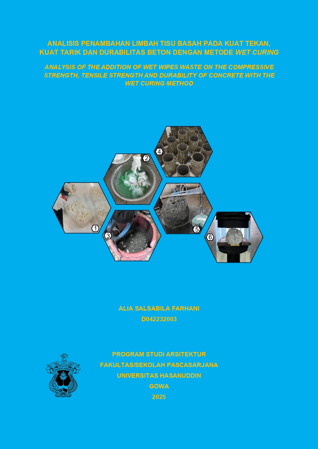 FARHANI, ALIA SALSABILA (2025) ANALISIS PENAMBAHAN LIMBAH TISU BASAH PADA KUAT TEKAN, KUAT TARIK DAN DURABILITAS BETON DENGAN METODE WET CURING = ANALYSIS OF THE ADDITION OF WET WIPES WASTE ON THE COMPRESSIVE STRENGTH, TENSILE STRENGTH AND DURABILITY OF CONCRETE WITH THE WET CURING METHOD. Thesis thesis, Universitas Hasanuddin.