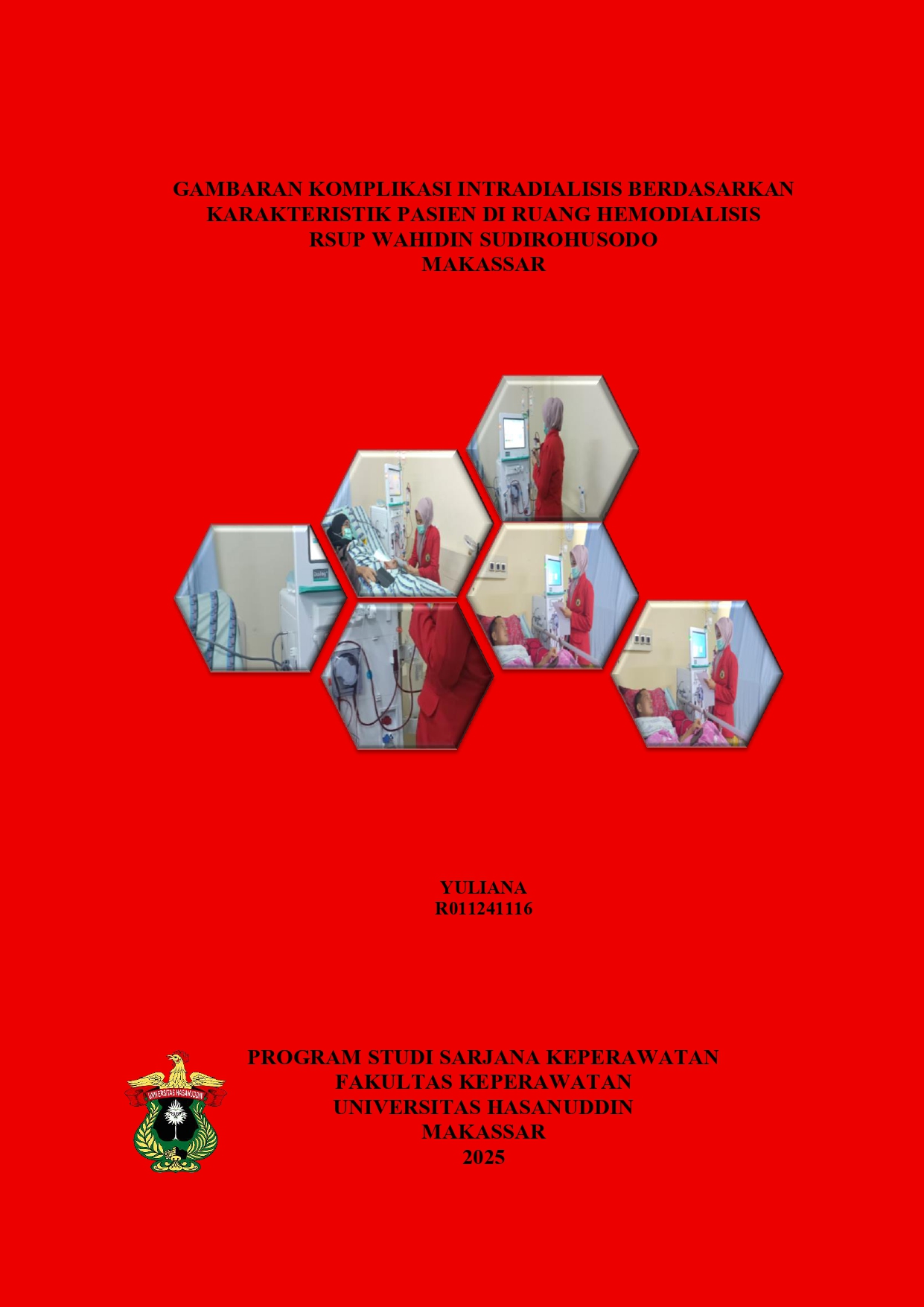 YULIANA. Gambaran Komplikasi Intradialisis Berdasarkan Karakteristik Pasien di Ruang Hemodialisis RSUP Wahidin Sudirohusodo Makassar (dibimbing oleh Aulia Insani Latif) Latar belakang: Hemodialisis adalah terapi penyelamat nyawa bagi pasien CKD, namun prosedur ini tidak lepas dari risiko komplikasi. Komplikasi intradialisis yang muncul selama hemodialisis dapat memengaruhi keselamatan pasien serta efektivitas pengobatan. Komplikasi tersebut umumnya terjadi selama atau setelah proses hemodialisis. Tujuan: Untuk mengetahui gambaran komplikasi intradialisis berdasarkan karakteristik pasien di ruang hemodialisis RSUP Wahidin Sudirohusodo Makassar. Metode: Penelitian ini merupakan penelitian deskriptif dengan jumlah sampel sebanyak 124 pasien CKD yang menjalani terapi hemodialisis, yang dipilih menggunakan teknik purposive sampling. Instrumen penelitian yang digunakan berupa lembar observasi. Hasil: Penelitian menunjukkan bahwa mayoritas pasien mengalami komplikasi intradialisis, yakni sebanyak 91,1%. Komplikasi yang paling sering terjadi adalah hipertensi, dengan prevalensi sebesar 41,1%. Analisis karakteristik pasien yang mengalami komplikasi intradialisis menunjukkan bahwa pasien tersebut lebih cenderung berusia lanjut (>65 tahun) sebesar 100,0%, berjenis kelamin laki-laki 93,7%, berpendidikan setingkat SMP 94,4%, tidak bekerja 93,8%, menderita CKD >5 tahun 100,0%, telah menjalani hemodialisis >24 bulan 100,0%, menggunakan AV shunt 93,8%, frekuensi HD 2 kali seminggu 93,9%, memiliki riwayat komorbiditas 100,0%, memiliki IDWG kategori sedang 100,0%, berstatus gizi obesitas 100,0%, serta memiliki tekanan darah pra-dialisis tinggi (hipertensi) 100,0%. Kesimpulan: Pasien CKD yang menjalani terapi hemodialisis mengalami komplikasi intradialisis, dengan hipertensi sebagai komplikasi yang paling sering terjadi. Pasien yang mengalami komplikasi intradialisis cenderung berusia lanjut (>65 tahun), berjenis kelamin laki-laki, berpendidikan setingkat SMP, tidak bekerja, menderita CKD >5 tahun, telah menjalani hemodialisis >24 bulan, menggunakan AV shunt, frekuensi HD 2 kali seminggu, memiliki riwayat komorbiditas, memiliki IDWG kategori sedang, berstatus gizi obesitas, serta memiliki tekanan darah pra-dialisis tinggi. Kata Kunci: Cronik kidney disease, Hemodialisis, Komplikasi intradialisis. Kepustakaan: 79 Kepustakaan (2019-2025).