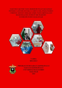 ABSTRAK NAHDIA. Faktor-Faktor yang Berhubungan Kejadian Infeksi Catheter Double Lumen (CDL) pada Pasien Chronic Kidney Disease (CKD) yang Menjalani Hemodialisis di RSUP Dr. Wahidin Sudirohusodo Makassar (dibimbing oleh Sri Bintari Rahayu) Latar belakang: Chronic Kidney Disease (CKD) merupakan salah satu masalah kesehatan global yang menjadi penyebab utama meningkatnya angka morbiditas dan mortalitas. Hemodialisis merupakan terapi pengganti ginjal yang esensial bagi pasien dengan CKD stadium akhir, yang umumnya menggunakan Catheter Double Lumen (CDL) sebagai akses vaskular. Namun, penggunaan CDL dapat meningkatkan risiko terjadinya Catheter-Related Bloodstream Infection (CRBSI). Infeksi ini merupakan salah satu komplikasi paling umum dan serius, karena dapat berujung pada bakteremia nosokomial dan sepsis. Tujuan: Untuk mengetahui faktor-faktor yang berhubungan kejadian infeksi CDL pada pasien CKD yang menjalani hemodialisis di RSUP Dr. Wahidin Sudirohusodo Makassar. Metode: Penelitian ini menggunakan kuantitatif korelasional dengan pendekatan cross sectional. Sampel pada penelitian ini berjumlah 102 pasien CKD yang menggunakan CDL di RSUP Dr. Wahidin Sudirohusodo Makassar menggunakan purposive sampling. Instrumen yang digunakan adalah lembar observasi komorbid, lokasi insersi, lama penggunaan kateter, status gizi, dan kejadian infeksi CDL, sedangkan lembar kuesioner yaitu kuesioner personal hygiene. Hasil: Penelitian menunjukkan hubungan komorbid (ρ=0,021), lokasi insersi (ρ=0,001), lama penggunaan kateter (ρ=0,028), status gizi (ρ=0,049), dan personal hygiene (ρ=0,152) dengan kejadian infeksi CDL pada pasien CKD yang menjalani hemodialisis di RSUP Dr. Wahidin Sudirohusodo Makassar. Kesimpulan: Ada hubungan komorbid, lokasi insersi, lama penggunaan kateter, status gizi dengan kejadian infeksi CDL pada pasien CKD yang menjalani hemodialisis, namun tidak ada hubungan personal hygiene dengan kejadian infeksi CDL pada pasien CKD yang menjalani hemodialisis di RSUP Dr. Wahidin Sudirohusodo Makassar. Kata Kunci: Infeksi, catheter double lumen, chronic kidney disease, hemodialisis Kepustakaan: 56 Kepustakaan (2019-2025) ABSTRACT NAHDIA. Factors Associated with Double Lumen Catheter (CDL) Infection in Chronic Kidney Disease (CKD) Patients Undergoing Hemodialysis at RSUP Dr. Wahidin Sudirohusodo, Makassar (supervised Sri Bintari Rahayu) Background: Chronic Kidney Disease is a global health problem that is a major cause of increasing morbidity and mortality. Hemodialysis is an essential renal replacement therapy for patients with end-stage CKD, who commonly use a Double Lumen Catheter for vascular access. However, the use of a CDL can increase the risk of Catheter-Related Bloodstream Infection. This infection is one of the most common and serious complications, as it can lead to nosocomial bacteremia and sepsis. Aim: To determine factors associated with the occurrence of CDL infections in CKD patients undergoing hemodialysis at RSUP Dr. Wahidin Sudirohusodo, Makassar. Method: This study used a quantitative correlational study with a cross-sectional approach. The sample size for this study was 102 CKD patients using a CDL at RSUP Dr. Wahidin Sudirohusodo, Makassar, using purposive sampling. The instruments used were observation sheets for comorbidities, insertion location, duration of catheter use, nutritional status, and the incidence of CDL infections, while the questionnaire included a personal hygiene questionnaire. Results: The study showed a correlation between comorbidities (ρ=0.021), insertion location (ρ=0.001), duration of catheter use (ρ=0.028), nutritional status (ρ=0.049), and personal hygiene (ρ=0.152) with the incidence of CDL infections in CKD patients undergoing hemodialysis at RSUP Dr. Wahidin Sudirohusodo, Makassar. Conclusion: There was a correlation between comorbidities, insertion location, duration of catheter use, and nutritional status with the incidence of CDL infections in CKD patients undergoing hemodialysis. However, there was no correlation between personal hygiene and the incidence of CDL infections in CKD patients undergoing hemodialysis at RSUP Dr. Wahidin Sudirohusodo, Makassar.