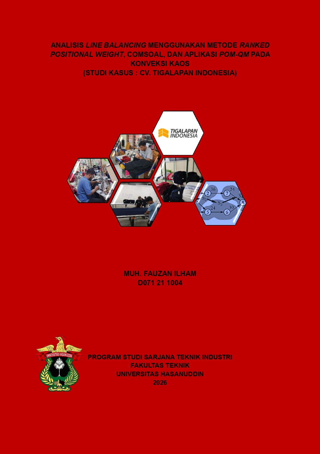 ABSTRAK Muh. Fauzan Ilham Analisis Line Balancing Menggunakan Metode Ranked Positional Weight, COMSOAL, dan Aplikasi POM-QM pada Konveksi Kaos (Studi Kasus : CV. Tigalapan Indonesia) (Dr. Eng. Ir. Irwan Setiawan, ST., MT., IPM., ASEAN Eng.). Penelitian ini menganalisis kinerja penyeimbangan lini produksi kaos di CV. Tigalapan Indonesia dengan menggunakan metode Ranked Positional Weight (RPW), Computer Method of Sequencing Operations for Assembly Lines (COMSOAL), dan pendekatan POM-QM. Evaluasi awal menunjukkan bahwa lini produksi beroperasi dengan tingkat line efficiency yang rendah sebesar 40,76%, yang mengindikasikan adanya ketidakseimbangan yang signifikan dalam pembagian tugas serta pemanfaatan stasiun kerja yang belum optimal. Pengukuran waktu kerja dilakukan melalui studi waktu untuk memperoleh waktu baku dan hubungan precedence antar elemen kerja, yang selanjutnya diolah menggunakan metode RPW, COMSOAL, dan POM-QM guna menghasilkan usulan alokasi tugas yang lebih baik. Hasil penerapan metode RPW dan COMSOAL menunjukkan peningkatan yang signifikan dengan menghasilkan line efficiency sebesar 82,04%, yang mencerminkan alur kerja yang lebih seimbang dan efisien. Pendekatan POM-QM juga menghasilkan kinerja yang sebanding pada beberapa metode heuristik, sehingga memperkuat efektivitas metode penyeimbangan lini berbasis heuristik. Hasil penelitian ini menunjukkan bahwa penerapan metode penyeimbangan lini secara sistematis mampu meningkatkan produktivitas, stabilitas operasional, dan pemanfaatan sumber daya pada lingkungan manufaktur garmen skala menengah.