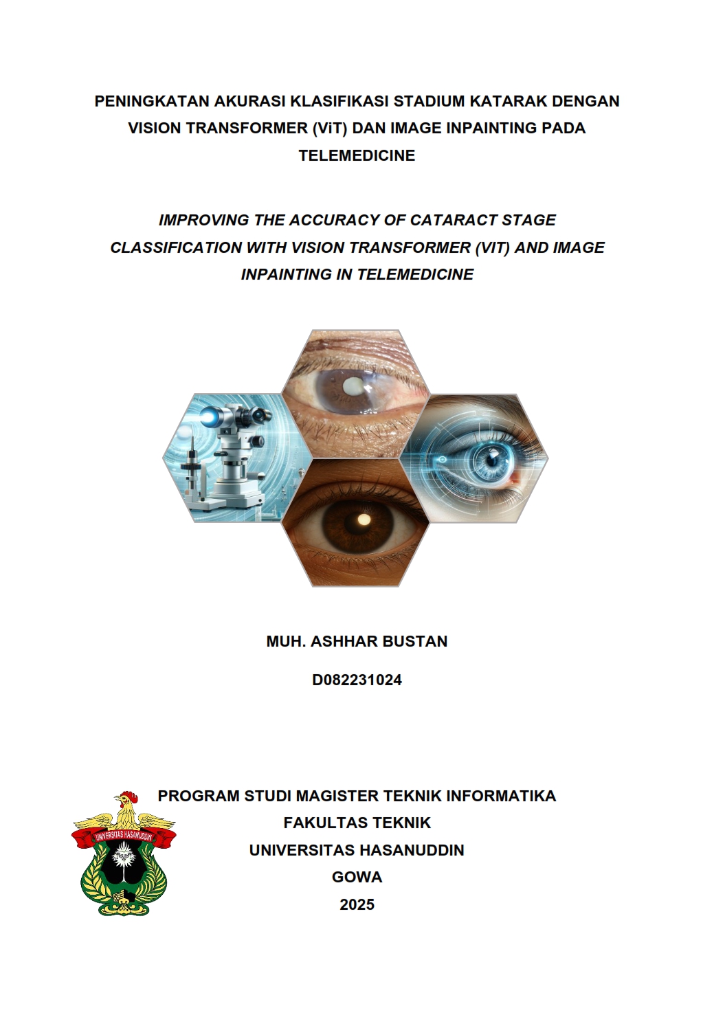 | Uncontrolled Keywords: | Klasifikasi Katarak, Telemedicine, Vision Transformer, Image Inpainting, Local Window Attention (LWA), Region of Interest (ROI) |