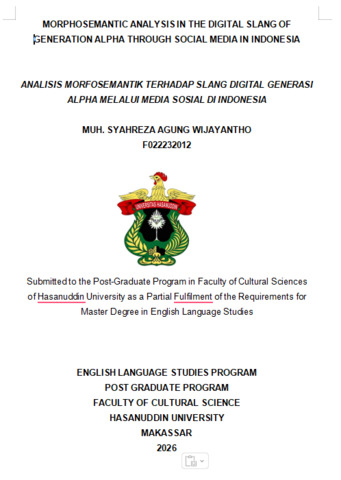 MUH. SYAHREZA AGUNG WIJAYANTHO. Morphosemantic Analysis in the Digital Slang of Generation Alpha through Social Media in Indonesia (supervised by Abdul Hakim Yassi and Sukmawaty). Background. Generation Alpha, born after 2010, grows up in a technology-driven environment with early exposure to social media, shaping their language and communication styles. Their use of digital slang reflects unique linguistic dynamics that have yet to be extensively explored. Objective. This study aims to analyse the forms of slang used by Generation Alpha in Indonesia and elaborated the slang by using Rochelle Lieber’s morphosemantic theory. It also aims to extend the theory from leiber. Method. A mixed-method approach was used to analyse 15 slangs collected from students of SMP Athirah and SMP 1 Pangkajene. Each slang term was analyzed morphologically and semantically using Lieber’s theory. Findings. The results reveal that the most dominant forms of slang are clipping, acronyms, and zero derivation. Each term carries semantic primitives such as BE, ACT, and HAVE. New terms such as sigma, alpha, rizz, and big L illustrate how Generation Alpha adopts and adapts expressions from Greek letters and viral internet culture. This study also extends Lieber’s theory by integrating digital and sociocultural dimensions. Conclusion. The digital slang used by Generation Alpha reflects a shift in communication patterns among Indonesian youth. Through morphosemantic analysis, this research offers deeper insights into how slang is formed and understood, while also contributing to the development of modern linguistic theory.