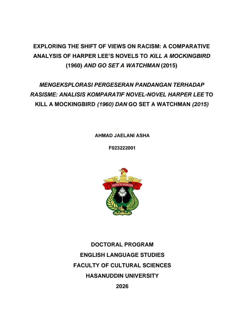 AHMAD JAELANI ASHA. Exploring The Shift of views on Racism: A Comparative Analysis of Harper Lee’s Novels To Kill A Mockingbird (1960) And Go Set A Watchman (2015) (supervised by Fathu Rahman, M. Amir P, and Herawaty Abbas) This study compares Harper Lee’s portrayals of Atticus Finch in To Kill a Mockingbird (1960) and Go Set a Watchman (2015) to trace shifts in racial attitude and character development, arguing these differences mirror broader mid-20th-century Southern tensions. Using a descriptive qualitative approach, the research conducts a comparative analysis of the primary texts alongside Harper Lee’s biography and other supporting sources. Findings reveal obvious divergence: 1) To Kill a Mockingbird, set in the 1930s, presents Atticus as a moral exemplar who models justice and empathy amid pervasive racism; 2) Go Set a Watchman, set in the 1950s, complicates that image by depicting him expressing segregationist and anti-federal sentiments. The change in Scout’s perspective from an innocent child’s narration in Mockingbird to an adult’s disillusioned viewpoint in Watchman intensifies the rupture between idealism and reality. Rather than treating the discrepancy as mere inconsistency, the study situates Atticus’s shifting portrayal within ideological conflicts of Southern class consciousness, regional anxieties about federal intervention, and the era’s racial politics. It also highlights external influences, Harper Lee’s personal ambivalence and editorial shaping that contributed to the contrasting depictions. Whereas Mockingbird constructs a hopeful, didactic vision of moral clarity, Watchman exposes internal contradictions in paternalistic Southern liberalism. The study concludes that Atticus’s transformed image reflects both changing social currents and complex authorial and editorial dynamics, offering a lens through which to read mid-century Southern identity and literary revision.