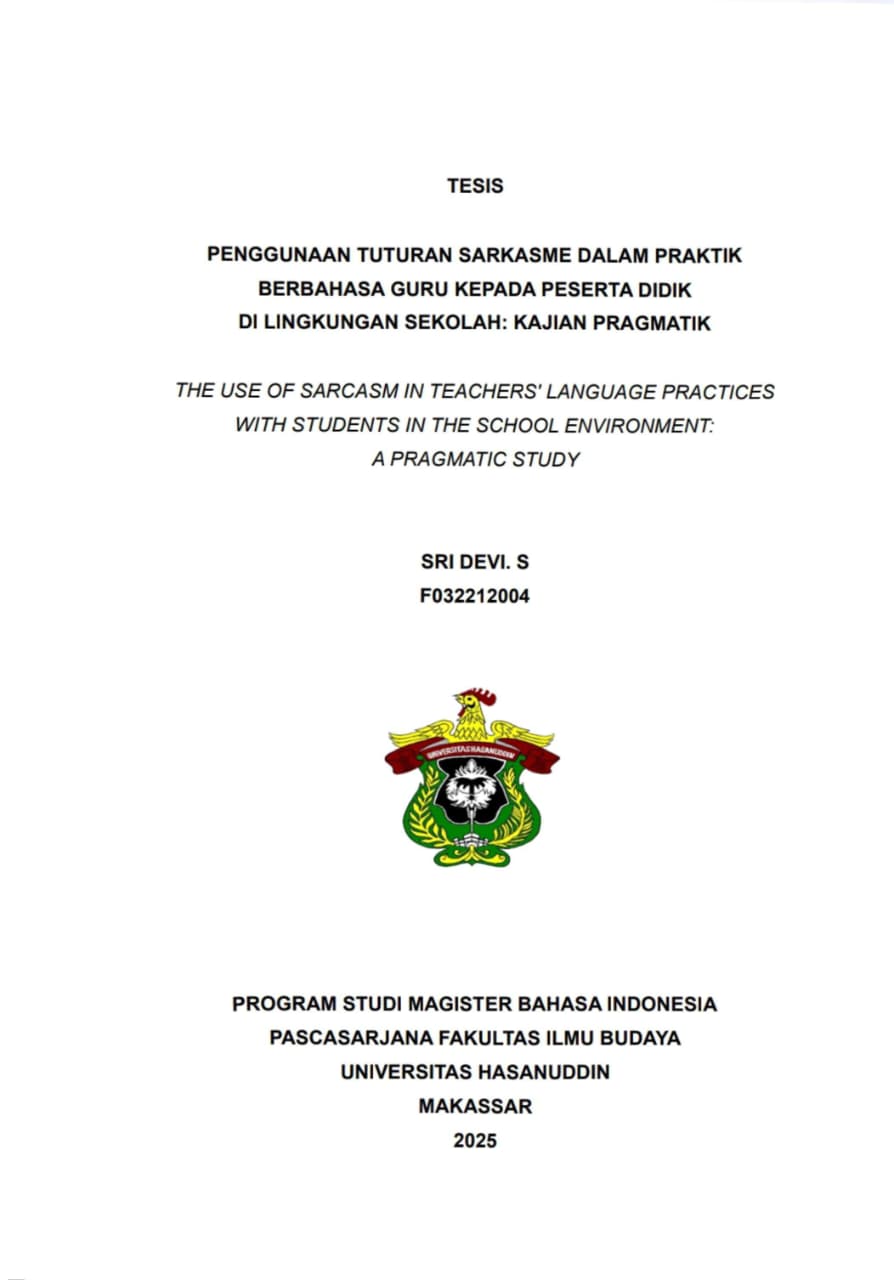 DEVI. S, SRI (2025) PENGGUNAAN TUTURAN SARKASME DALAM PRAKTIK BERBAHASA GURU KEPADA PESERTA DIDIK DI LINGKUNGAN SEKOLAH: KAJIAN PRAGMATIK = THE USE OF SARCASM IN TEACHERS' LANGUAGE PRACTICES WITH STUDENTS IN THE SCHOOL ENVIRONMENT: A PRAGMATIC STUDY. Thesis thesis, Universitas Hasanuddin.