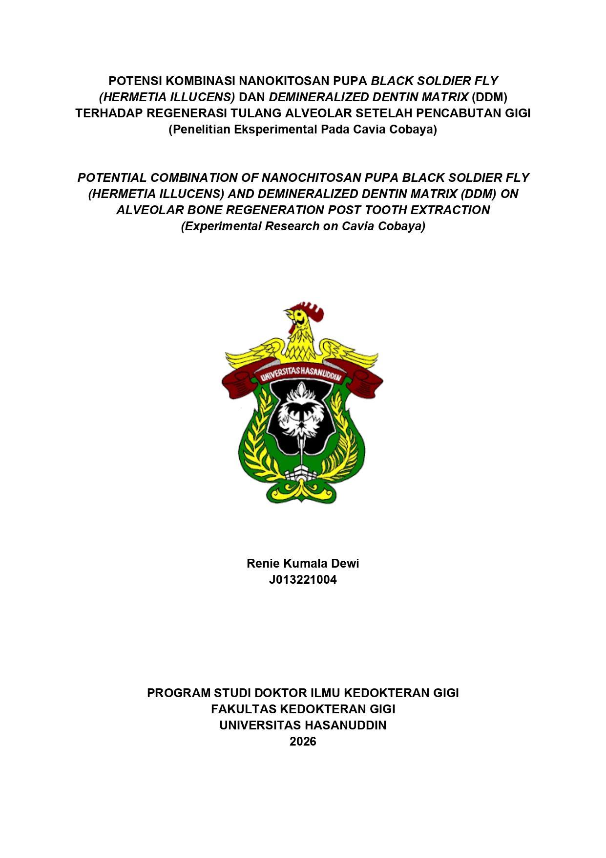 DEWI, RENIE KUMALA (2026) POTENSI KOMBINASI NANOKITOSAN PUPA BLACK SOLDIER FLY (HERMETIA ILLUCENS) DAN DEMINERALIZED DENTIN MATRIX (DDM) TERHADAP REGENERASI TULANG ALVEOLAR SETELAH PENCABUTAN GIGI (Penelitian Eksperimental Pada Cavia Cobaya) = POTENTIAL COMBINATION OF NANOCHITOSAN PUPA BLACK SOLDIER FLY (HERMETIA ILLUCENS) AND DEMINERALIZED DENTIN MATRIX (DDM) ON ALVEOLAR BONE REGENERATION POST TOOTH EXTRACTION (Experimental Research on Cavia Cobaya) Renie Kumala Dewi. Disertasi thesis, Universitas Hasanuddin.