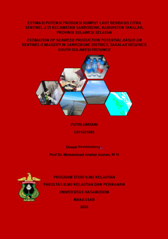 PUTRI ANRIANI. Estimasi Potensi Produksi Rumput Laut Berbasis Citra Sentinel-2 Di Kecamatan Sanrobone, Kabupaten Takalar, Provinsi Sulawesi Selatan (dibimbing oleh Prof Dr. Muhammad Anshar Amran, M.Si) Budidaya rumput laut di Kecamatan Sanrobone, Kabupaten Takalar, memiliki potensi ekonomi yang besar namun masih menghadapi kendala dalam estimasi potensi produksi. Ketidakakuratan data dan metode tradisional menghambat pengembangan optimal sektor ini. Teknologi penginderaan jauh berbasis citra Sentinel-2 berpotensi untuk memberikan data spasial yang akurat dan mendukung estimasi yang lebih tepat. Penelitian ini bertujuan untuk mengestimasi potensi produksi rumput laut di Kecamatan Sanrobone dengan memanfaatkan citra Sentinel-2 Level 2A, serta menganalisis distribusi spasial dan faktor lingkungan yang memengaruhi hasil budidaya. Proses kerja dimulai dengan pengunduhan citra Sentinel-2 Level 2A dari portal EO Browser, kemudian dilakukan koreksi geometrik untuk memperbaiki distorsi layanan satelit. Selanjutnya, citra dipotong (Cropping) sesuai batas wilayah kecamatan terkait menggunakan koordinat yang diperoleh dari registrasi citra. Landmasking dilakukan untuk memisahkan wilayah perairan yang relevan. Pengolahan citra selanjutnya berupa klasifikasi untuk mengidentifikasi dan memetakan area budidaya rumput laut berdasarkan spektrum citra. Di lapangan, diambil titik koordinat, diukur suhu, salinitas, dan tingkat kekeruhan air di setiap stasiun sebagai faktor pendukung. Data lapangan ini digunakan untuk validasi hasil klasifikasi citra dan memperkirakan potensi produksi berdasarkan luas area dan parameter lingkungan. Data dikompilasi dan dianalisis secara statistik untuk mendapatkan estimasi output produksi. Hasil penelitian menunjukkan bahwa citra Sentinel-2 mampu menyediakan estimasi produksi area budidaya rumput laut secara akurat. Parameter lingkungan seperti suhu, salinitas, dan kekeruhan berpengaruh signifikan terhadap potensi produksi. Estimasi produksi tahunan berdasarkan luas area dan kondisi lingkungan menunjukkan potensi yang dapat ditingkatkan dengan pengelolaan yang optimal. Penggunaan citra Sentinel-2, melalui proses koreksi geometrik, Cropping, dan klasifikasi, efektif dalam memetakan dan memperkirakan potensi produksi rumput laut di wilayah tersebut. Data spasial dan lingkungan yang diperoleh mendukung pengelolaan.