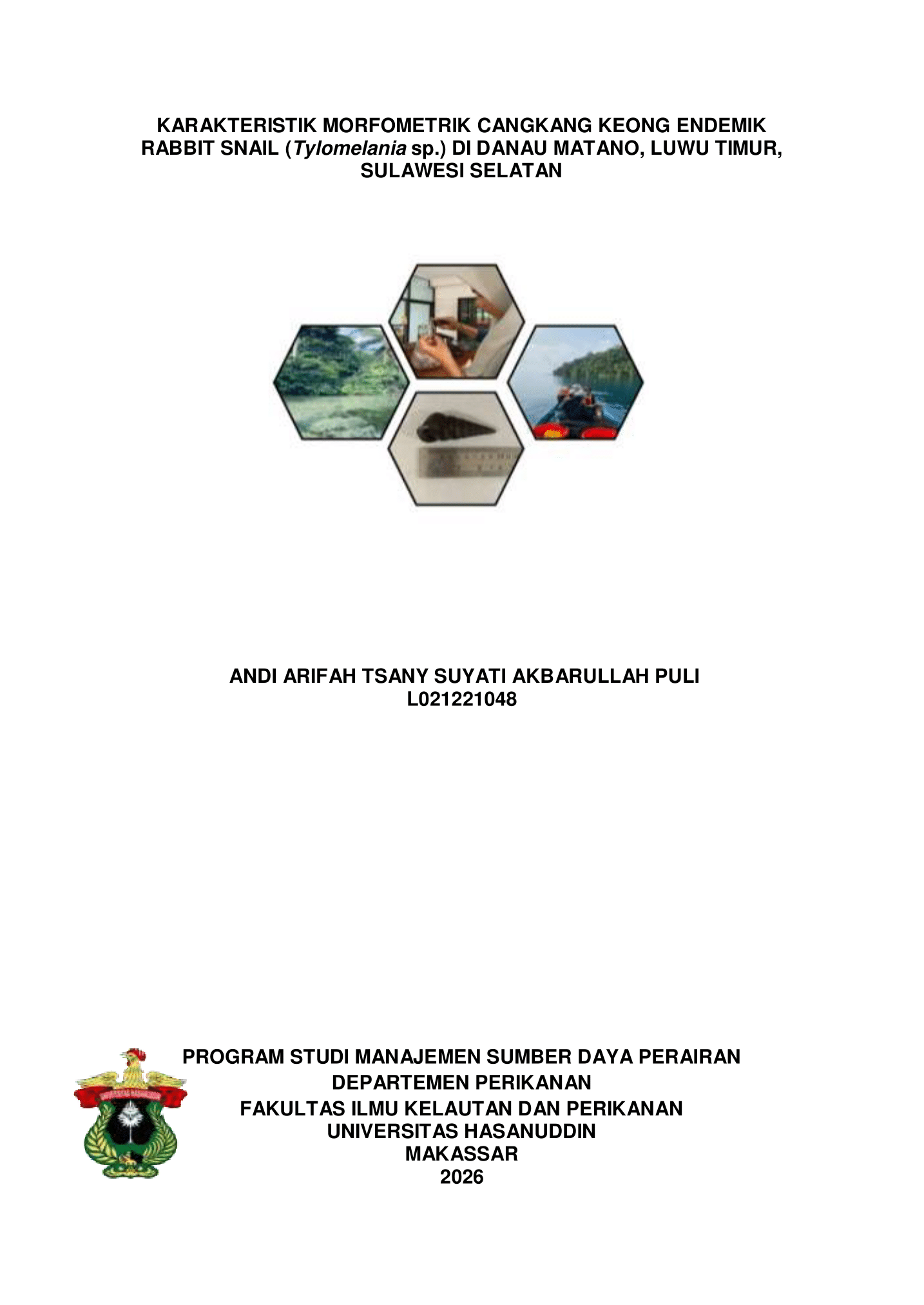 ANDI ARIFAH TSANY SUYATI AKBARULLAH PULI “Karakteristik morfometrik cangkang keong endemik rabbit snail (Tylomelania sp.) di Danau Matano, Luwu Timur, Sulawesi Selatan” dibimbing oleh Sharifuddin Bin Andy Omar. Latar belakanng. Tylomelania sp. merupakan gastropoda endemik Kompleks Danau Malili yang memiliki keragaman morfologi tinggi dan berperan penting dalam ekosistem perairan sebagai herbivor dan detritivor. Danau Matano merupakan danau purba yang bersifat oligotrofik, menyediakan kondisi lingkungan stabil yang memungkinkan terjadinya variasi karakter morfometrik pada populasi Tylomelania sp. Tujuan. Penelitian ini bertujuan untuk menganalisis variasi karakter morfometrik cangkang Tylomelania sp. yang terdapat di perairan D.Matano, Kabupaten Luwu Timur. Metode. Pengambilan sampel dilakukan selama tiga bulan, yaitu Agustus hingga Oktober 2025, menggunakan metode hand sorting pada satu stasiun pengamatan di Padang Ilalang. Sebanyak 115 individu Tylomelania sp. dianalisis berdasarkan enam parameter morfometrik, meliputi panjang total cangkang, panjang standar, panjang lingkaran cangkang, lebar cangkang, lebar bukaan cangkang dan panjang bukaan cangkang. Data dianalisis secara deskriptif dan diuji menggunakan uji Kruskal–Wallis untuk mengetahui perbedaan karakter morfometrik antarwaktu pengambilan sampel. Hasil. Hasil penelitian menunjukkan adanya variasi ukuran cangkang yang cukup tinggi dengan pola peningkatan ukuran pada bulan September dan cenderung stabil pada bulan Oktober. Uji statistik menunjukkan bahwa sebagian besar karakter morfometrik berbeda signifikan antarbulan pengamatan (p < 0,05), yang mengindikasikan adanya dinamika pertumbuhan yang dipengaruhi oleh kondisi lingkungan perairan. Kesimpulan. Temuan ini menunjukkan bahwa Tylomelania sp. memiliki plastisitas morfologis yang tinggi dan berpotensi menjadi indikator biologis kondisi ekosistem perairan D.Matano.