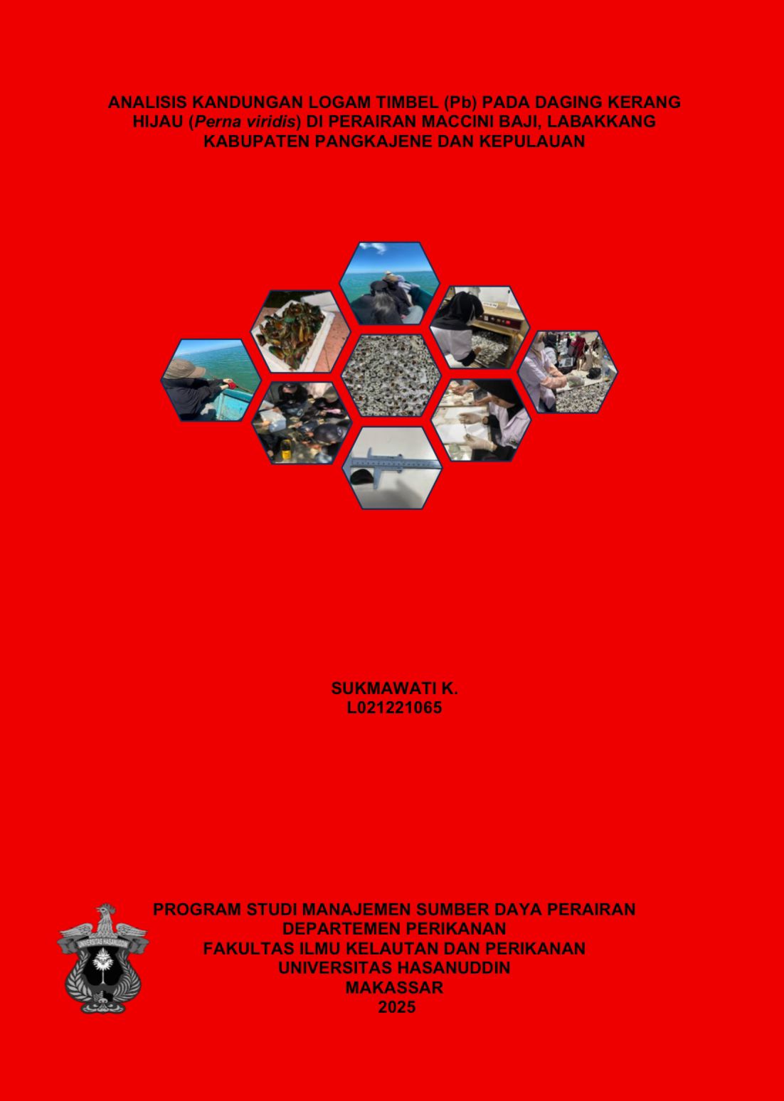 SUKMAWATI K. Analisis Kandungan Logam Timbel (Pb) Pada Daging Kerang Hijau (Perna viridis) di Perairan Maccini Baji, Labakkang Kabupaten Pangkajene Dan Kepulauan “dibimbing oleh Khusnul Yaqin”. Latar Belakang. Perairan Maccini Baji merupakan wilayah pusat aktivitas nelayan sekaligus sumber matapencaharian masyarakat. Namun, aktivitas nelayan, pertanian, dan rumah tangga berpotensi mencemari perairan. Logam timbel (Pb) bersifat toksik, sulit terurai, dan dapat terakumulasi dalam biota laut termasuk Kerang Hijau (Perna viridis) yang berperan sebagai organisme filter feeder, sehingga mudah terpapar logam. Tujuan. Penelitian ini bertujuan untuk menganalisis kandungan logam timbel (Pb) pada daging Kerang Hijau (Perna viridis) di Perairan Maccini Baji, Labakkang Kabupaten Pangkajene dan Kepulauan serta hubungan antara Indeks Kondisi (IK) dengan Indeks Bioavailabilitas Logam dalam Kerang (IBLK) pada daging Kerang Hijau (Perna viridis) di Perairan Maccini Baji, Labakkang Kabupaten Pangkajene dan Kepulauan. Metode. Penelitian ini dilakukan pada bulan Juni 2025. Analisis logam dilakukan menggunakan Spektrofotometer Serapan Atom (SSA). Data parameter morfologi ditabulasi menggunakan Microsoft Excel. Analisis uji Mann-Whitney U menggunakan GraphPad PRISM 9.0 untuk membandingan kandungan logam timbel (Pb), Indeks Kondisi dan IBLK pada daging Kerang Hijau antarstasiun yang disesuaikan dengan standar baku mutu cemaran logam menurut SNI 7387 Tahun 2009. Korelasi antara Indeks Kondisi (IK) dengan Indeks Bioavailabilitas Logam dalam Kerang (IBLK) dianalisis menggunakan korelasi Spearman r. Hasil. Rata-rata kandungan logam timbel (Pb) pada daging Kerang Hijau (Perna viridis) di stasiun 1 sebesar 0,72 mg/kg dan di stasiun 2 sebesar 1,18 mg/kg. Kandungan tertinggi ditemukan pada kerang berukuran 3,63-3,92 cm sebesar 1,8143 mg/kg yang telah melampaui ambang batas SNI 7387 Tahun 2009. Nilai indeks kondisi antarstasiun diketahui terdapat perbedaan yang signifikan pada indeks kondisi 5-10. Nilai rata-rata IBLK di stasiun 1 sebesar 0,40 mg/kg dan di stasiun 2 sebesar 0,66 mg/kg, tanpa perbedaan signifikan antarstasiun. Hasil uji korelasi IK dengan IBLK tidak ditemukan hasil yang signifikan pada kedua stasiun sehingga tidak dapat dijadikan sebagai model untuk dijadikan sebagai indikator dalam memprediksi pencemaran yang ada di perairan tersebut. Kesimpulan. Kandungan logam timbel (Pb) pada sebagian sampel Kerang Hijau (Perna viridis) di Perairan Maccini Baji telah melampaui batas maksimum cemaran logam, sehingga tidak aman dikonsumsi secara berlebihan. Nilai korelasi antara IK dan IBLK tidak signifikan, sehingga tidak dapat dijadikan sebagai indikator dalam memprediksi tingkat pencemaran perairan.
