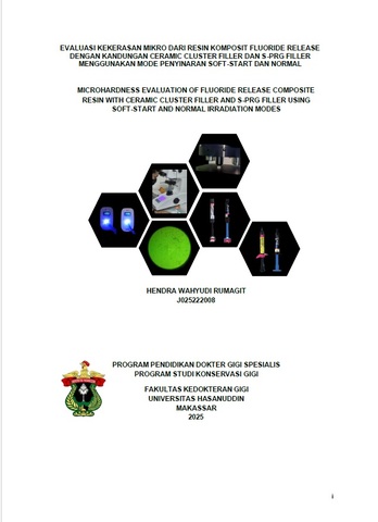 RUMAGIT, HENDRA WAHYUDI (2025) EVALUASI KEKERASAN MIKRO DARI RESIN KOMPOSIT FLUORIDE RELEASE DENGAN KANDUNGAN CERAMIC CLUSTER FILLER DAN S-PRG FILLER MENGGUNAKAN MODE PENYINARAN SOFT-START DAN NORMAL = MICROHARDNESS EVALUATION OF FLUORIDE RELEASE COMPOSITE RESIN WITH CERAMIC CLUSTER FILLER AND S-PRG FILLER USING SOFT-START AND NORMAL IRRADIATION MODES. Thesis thesis, Universitas Hasanuddin.