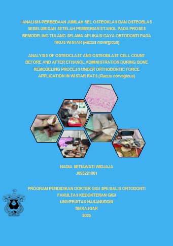 WIDJAJA, NADIA SETIAWATI (2025) ANALISIS PERBEDAAN JUMLAH SEL OSTEOKLAS DAN OSTEOBLAS SEBELUM DAN SETELAH PEMBERIAN ETANOL PADA PROSES REMODELING TULANG SELAMA APLIKASI GAYA ORTODONTI PADA TIKUS WISTAR (Rattus novergicus) = ANALYSIS OF OSTEOCLAST AND OSTEOBLAST CELL COUNT BEFORE AND AFTER ETHANOL ADMINISTRATION DURING BONE REMODELING PROCESS UNDER ORTHODONTIC FORCE APPLICATION IN WISTAR RATS (Rattus norvegicus). Thesis thesis, Universitas Hasanuddin.