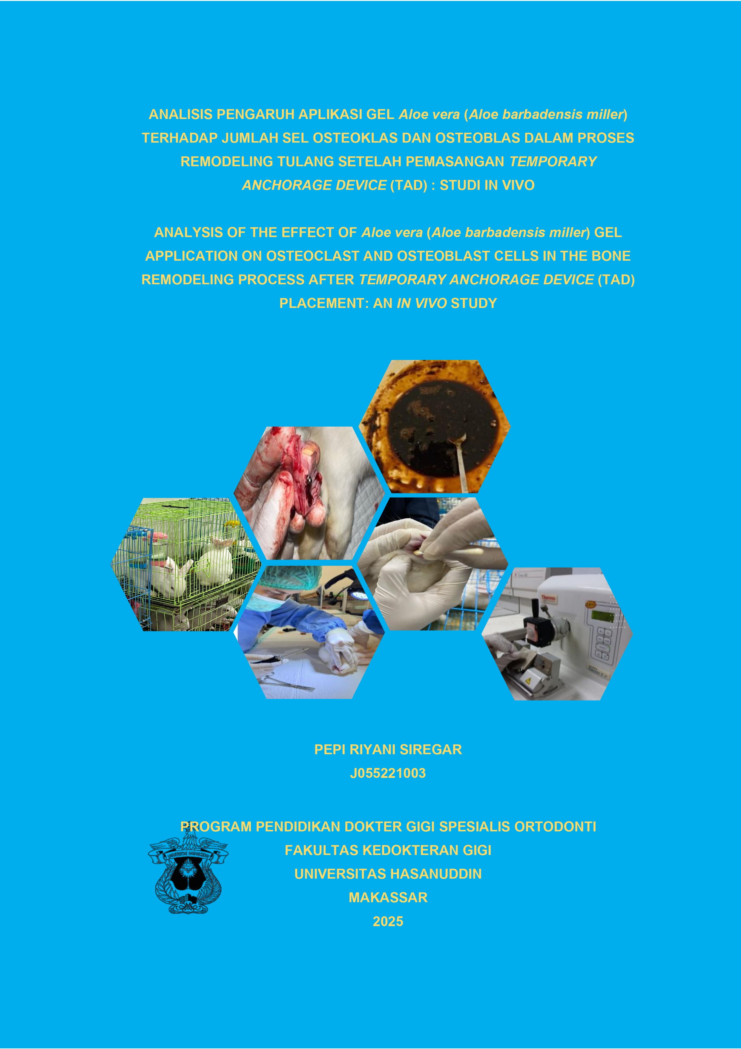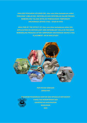 SIREGAR, PEPI RIYANI (2025) ANALISIS PENGARUH APLIKASI GEL Aloe vera (Aloe barbadensis miller) TERHADAP JUMLAH SEL OSTEOKLAS DAN OSTEOBLAS DALAM PROSES REMODELING TULANG SETELAH PEMASANGAN TEMPORARY ANCHORAGE DEVICE (TAD) : STUDI IN VIVO STUDY = ANALYSIS OF THE EFFECT OF Aloe vera (Aloe barbadensis miller) GEL APPLICATION ON OSTEOCLAST AND OSTEOBLAST CELLS IN THE BONE REMODELING PROCESS AFTER TEMPORARY ANCHORAGE DEVICE (TAD) PLACEMENT: AN IN VIVO STUDY. Thesis thesis, Universitas Hasanuddin.