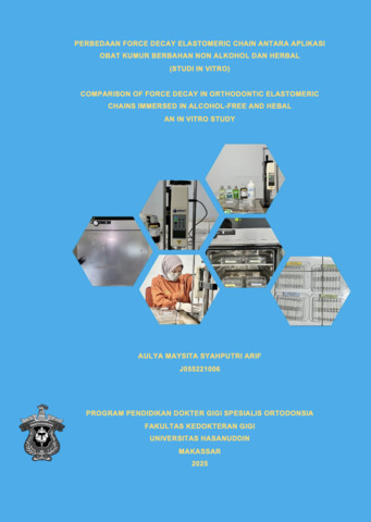 ABSTRAK Aulya Maysita Syahputri Arif. Perbedaan Force Decay Elastomeric Chain Antara Aplikasi Obat Kumur Berbahan Non Alkohol dan Herbal :Studi in Vitro (dibimbing oleh Eddy Heriyanto Habar dan Zilal Islamy Paramma) Tujuan: Penelitian in vitro ini bertujuan untuk mengevaluasi dan membandingkan penurunan gaya (force decay) pada elastomeric chain ortodonti setelah perendaman dalam obat kumur berbahan non-alkohol dan berbahan herbal selama periode 21 hari. Metode: Sebanyak 64 sampel elastomeric chain Ormco® Generasi II tipe continuous warna bening dibagi ke dalam empat kelompok (masing-masing n=16): kelompok perendaman dalam obat kumur non-alkohol (Listerine® Zero), dua kelompok obat kumur herbal (Pepsodent® Herbal Mouthwash dan Listerine® Green Tea), serta satu kelompok kontrol yang direndam dalam saliva buatan. Semua sampel direnggangkan sejauh 25 mm pada plat akrilik dan diinkubasi pada suhu 37°C untuk mensimulasikan kondisi intraoral. Perendaman dilakukan dua kali sehari selama 30 detik. Pengukuran gaya dilakukan menggunakan alat digital force gauge pada hari ke-0, 1, 7, 14, dan 21. Analisis data dilakukan dengan uji Friedman dan Wilcoxon untuk perbandingan intrakelompok, serta uji Mann–Whitney untuk perbandingan antar kelompok. Hasil: Penurunan gaya yang signifikan tercatat pada seluruh kelompok seiring waktu (p < 0,0001). Penurunan gaya terbesar terjadi pada kelompok yang direndam dalam Listerine® Green Tea, diikuti oleh Listerine® Zero, Pepsodent® Daun Sirih, dan kelompok kontrol. Penurunan gaya paling tajam terjadi dalam 24 jam pertama, kemudian melambat pada hari-hari berikutnya. Kesimpulan: Obat kumur berbahan non-alkohol maupun herbal secara signifikan mempengaruhi kestabilan gaya pada elastomeric chain ortodonti. Obat kumur berbahan herbal menunjukkan tingkat force decay yang lebih rendah dibandingkan non-alkohol. Hasil ini menunjukkan pentingnya pemilihan jenis obat kumur yang tepat pada pasien ortodonti pengguna elastomeric chain.ABSTRAK Aulya Maysita Syahputri Arif. Perbedaan Force Decay Elastomeric Chain Antara Aplikasi Obat Kumur Berbahan Non Alkohol dan Herbal :Studi in Vitro (dibimbing oleh Eddy Heriyanto Habar dan Zilal Islamy Paramma) Tujuan: Penelitian in vitro ini bertujuan untuk mengevaluasi dan membandingkan penurunan gaya (force decay) pada elastomeric chain ortodonti setelah perendaman dalam obat kumur berbahan non-alkohol dan berbahan herbal selama periode 21 hari. Metode: Sebanyak 64 sampel elastomeric chain Ormco® Generasi II tipe continuous warna bening dibagi ke dalam empat kelompok (masing-masing n=16): kelompok perendaman dalam obat kumur non-alkohol (Listerine® Zero), dua kelompok obat kumur herbal (Pepsodent® Herbal Mouthwash dan Listerine® Green Tea), serta satu kelompok kontrol yang direndam dalam saliva buatan. Semua sampel direnggangkan sejauh 25 mm pada plat akrilik dan diinkubasi pada suhu 37°C untuk mensimulasikan kondisi intraoral. Perendaman dilakukan dua kali sehari selama 30 detik. Pengukuran gaya dilakukan menggunakan alat digital force gauge pada hari ke-0, 1, 7, 14, dan 21. Analisis data dilakukan dengan uji Friedman dan Wilcoxon untuk perbandingan intrakelompok, serta uji Mann–Whitney untuk perbandingan antar kelompok. Hasil: Penurunan gaya yang signifikan tercatat pada seluruh kelompok seiring waktu (p < 0,0001). Penurunan gaya terbesar terjadi pada kelompok yang direndam dalam Listerine® Green Tea, diikuti oleh Listerine® Zero, Pepsodent® Daun Sirih, dan kelompok kontrol. Penurunan gaya paling tajam terjadi dalam 24 jam pertama, kemudian melambat pada hari-hari berikutnya. Kesimpulan: Obat kumur berbahan non-alkohol maupun herbal secara signifikan mempengaruhi kestabilan gaya pada elastomeric chain ortodonti. Obat kumur berbahan herbal menunjukkan tingkat force decay yang lebih rendah dibandingkan non-alkohol. Hasil ini menunjukkan pentingnya pemilihan jenis obat kumur yang tepat pada pasien ortodonti pengguna elastomeric chain.