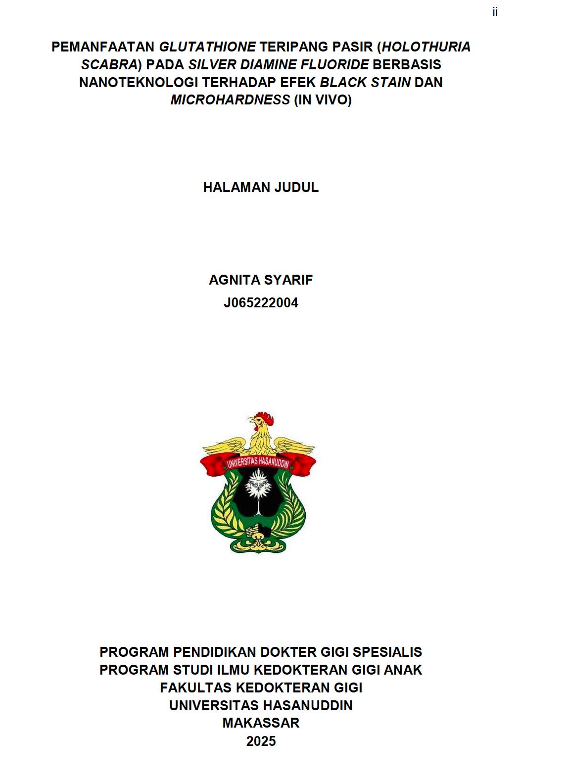 SYARIF, AGNITA (2025) PEMANFAATAN GLUTATHIONE TERIPANG PASIR (HOLOTHURIA SCABRA) PADA SILVER DIAMINE FLUORIDE BERBASIS NANOTEKNOLOGI TERHADAP EFEK BLACK STAIN DAN MICROHARDNESS (IN VIVO) = UTILIZATION OF SEA CUCUMBER (HOLOTHURIA SCABRA) DERIVED GLUTATHIONE IN NANOTECHNOLOGY-BASED SILVER DIAMINE FLUORIDE ON BLACK STAIN FORMATION AND MICROHARDNESS: AN IN VIVO STUDY. Thesis thesis, Universitas Hasanuddin.