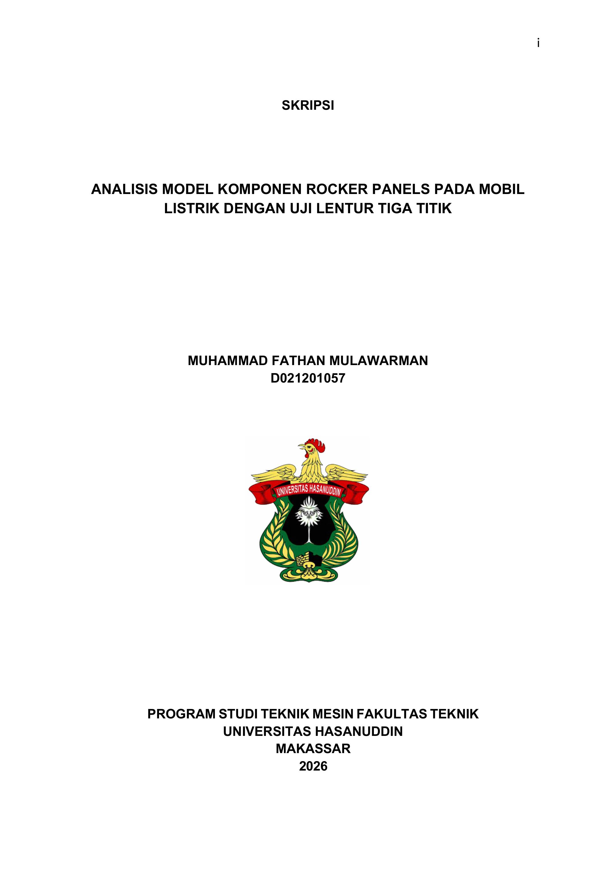MULAWARMAN, MUHAMMAD FATHAN (2026) Analisis Model Komponen Rocker Panels Pada Mobil Listrik Dengan Uji Lentur Tiga Titik = Analysis Of Rocker Panels Component Model on Electric Vehicles Using Three Point Bending Test. Skripsi thesis, Universitas Hasanuddin.