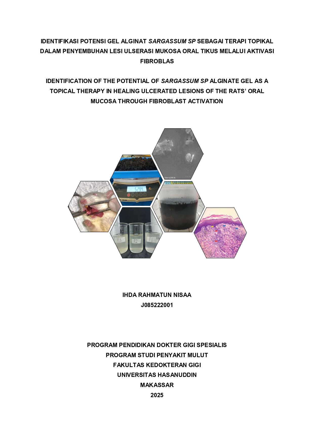 NISAA, IHDA RAHMATUN (2025) Identifikasi Potensi Gel Alginat Sargassum sp sebagai Terapi Topikal dalam Penyembuhan Lesi Ulserasi Mukosa Oral Tikus melalui Aktivasi Fibroblas = Identification of the Potential of Sargassum sp Alginate Gel as a Topical Therapy in Healing Ulcerated Lesions of the Rats' Oral Mucosa through Fibroblast Activation. Thesis thesis, Universitas Hasanuddin.
