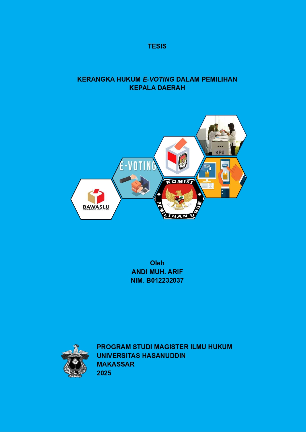 ANDI MUH. ARIF (B012232037), Kerangka Hukum E-Voting Dalam Pemilihan Kepala Daerah. Dibimbing oleh Zulkifli Aspan. Penelitian ini bertujuan untuk menganalisis keselarasan antara pemilihan berbasis e-voting dengan perwujudan asa jujur dan adil dalam pemilihan umum dan Menganalisis menganalisis konstruksi ideal pengaturan syarat penerapan pemilihan kepala daerah berbasis elektronik voting. Penelitian ini menggunakan metode penelitian hukum normatif. Penelitian ini menggunakan pendekatan kasus, pendekatan perbandingan, pendekatan filosofis dan pendekatan konseptual. Jenis data yang digunakan adalah data primer dan sekunder. Analisis data dilakukan secara logis deduktif berdasarkan perspektif normatif serta analisis data kualitatif dari lapangan disajikan secara deskriptif dalam penulisan yang sistematis untuk menjawab permasalahan yang telah dirumuskan. Hasil penelitian ini menunjukkan bahwa (1) Penerapan e-voting dalam pemilihan kepala daerah memiliki potensi besar untuk meningkatkan efisiensi dan efektivitas penyelenggaraan pemilu, baik dari segi waktu, biaya, maupun akurasi proses. Namun, potensi tersebut masih bergantung pada kesiapan infrastruktur teknologi, kapasitas sumber daya manusia, serta kepercayaan publik terhadap sistem yang digunakan. (2) Konstruksi ideal pengaturan e-voting harus disusun berdasarkan pendekatan sistem hukum yang mencakup aspek substansi hukum, struktur kelembagaan penyelenggara dan pengawas, serta kesiapan budaya hukum masyarakat. Pembentukan norma baru dalam Undang-Undang Pilkada dan peraturan teknis pelaksanaan menjadi prasyarat penting untuk menjamin kepastian hukum dan keberhasilan penerapan e-voting dalam pemilihan kepala daerah.