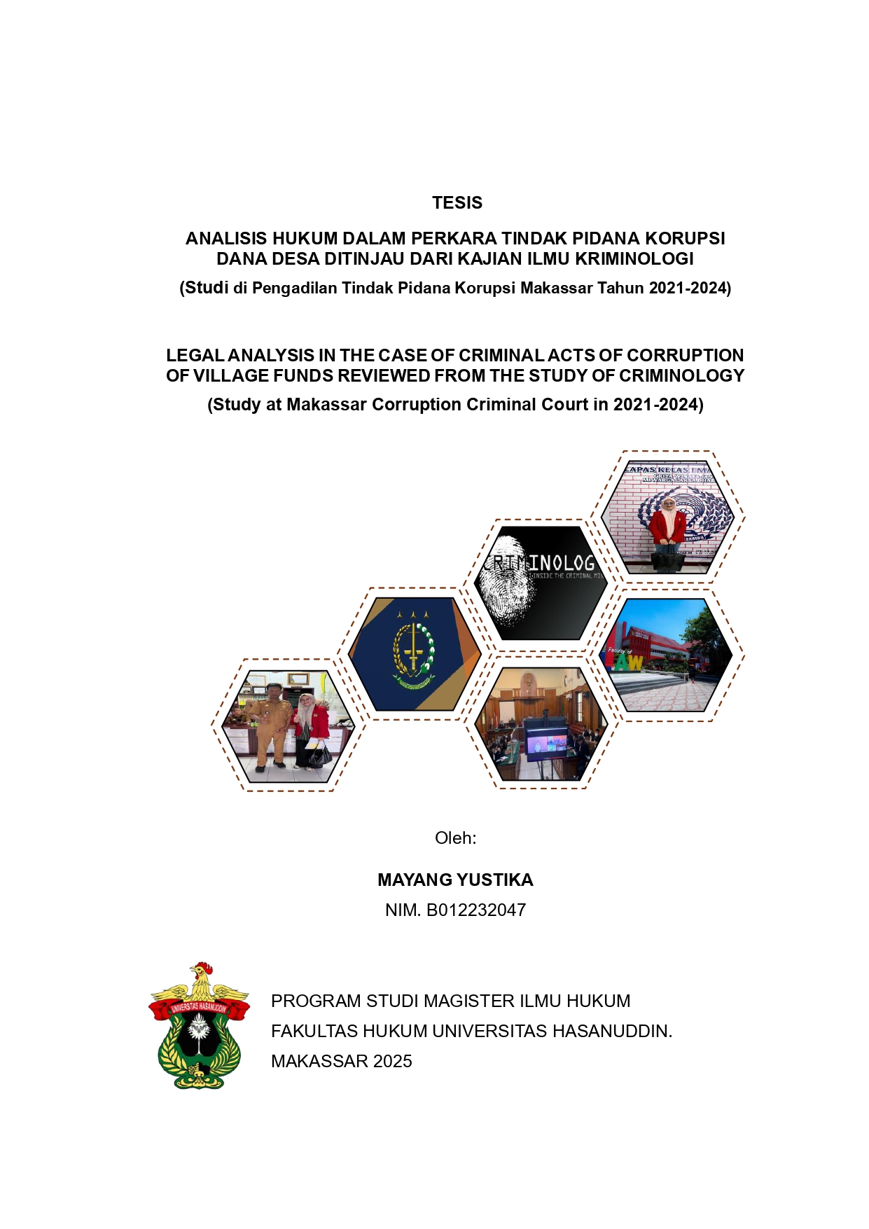 ABSTRAK MAYANG YUSTIKA (B012232047). JUDUL PENELITIAN Analisis Hukum Dalam Perkara Tindak Pidana Korupsi Dana Desa Ditinjau Dari Kajian Ilmu Kriminologi (Studi pengadilan tindak pidana korupsi makassar tahun 2021-2024), dibimbing oleh Syarif Saddam Rivanie sebagai pembimbing. Latar Belakang: Penelitian ini bertujuan untuk menganalisis faktor penyebab korupsi dana desa, implementasi dan implikasi sosial putusan hakim dalam perkara tindak pidana korupsi dana desa di wilayah hukum Pengadilan Negeri Makassar tahun 2021-2024 dengan pendekatan ilmu kriminologi. Tujuan: Menganalisis faktor penyebab pelaku, implementasi serta implikasi sosial putusan hakim pada tindak pidana korupsi dana desa. Metode: Penelitian hukum empiris dengan lokasi penelitian di Pengadilan Negeri Makassar, Lapas Kelas I Makassar, Kejaksaan Negeri Gowa, Desa Pakatto. menggunakan data primer, yaitu data yang diperoleh secara langsung di lapangan melalui wawancara dan hasil wawancara tidak langsung melalui media. Selain itu, data sekunder yang diperoleh melalui dokumen-dokumen perundang-undangan serta putusan, jurnal ilmiah, artikel ilmiah, dan sumber internet yang relevan. Teknik analisis yang digunakan pada penelitian ini bersifat deskriptif kualitatif. Hasil: Penelitian menunjukkan bahwa terjadinya tindak pidana korupsi dana desa dipengaruhi (1) faktor internal, dipengaruhi keinginan individu seperti tekanan ekonomi, rendahnya moralitas, rasionalisasi. Faktor eksternal sistem pengawasan lemah, struktur sosial dan sistem hukum. (2) dari aspek implementasi hukum hakim belum sepenuhnya memanfaatkan pendekatan ilmu kriminologi secara spesifik dalam menilai aspek sosial pelaku dan dampak perbuatannya, hal ini berimplikasi negatif pada aspek sosial seperti menurunnya kepercayaan masyarakat terhadap sistem hukum, tumbuhnya apatisme publik, melemahnya partisipasi masyarakat dalam pengawasan dana desa, serta normalisasi perilaku koruptif sebagai hal lumrah. Kesimpulan: Pembinaan moral aparatur desa, penguatan sistem pengawasan partisipasif berbasis digital, serta penegakan hukum yang transparan serta tegas untuk memperkuat efek jera dan mencegah korupsi.
