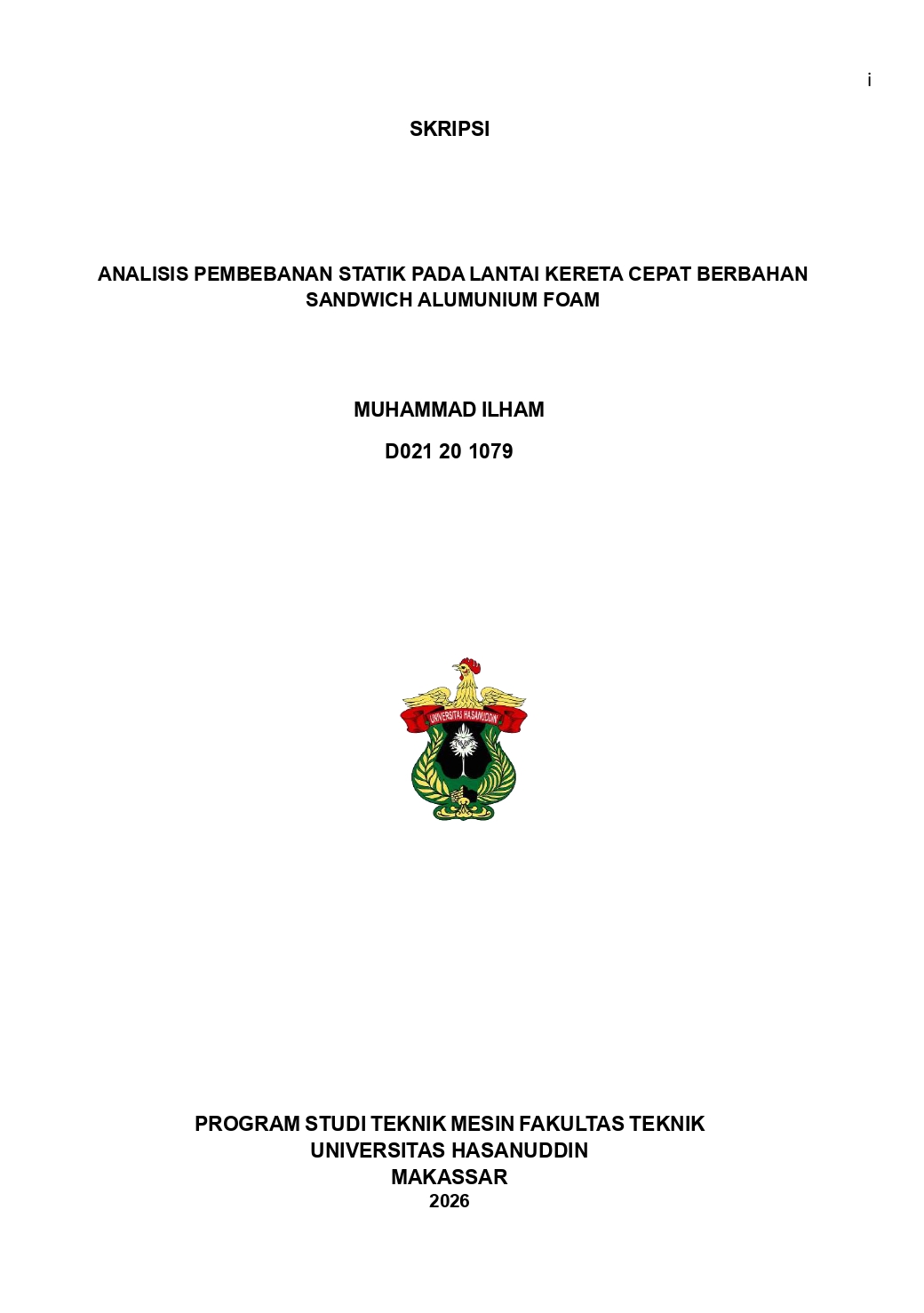 ILHAM, MUHAMMAD (2026) ANALISIS PEMBEBANAN STATIK PADA LANTAI KERETA CEPAT BERBAHAN SANDWICH ALUMUNIUM FOAM = Static Load Analysis on High-Speed Train Floor Using Aluminum Foam Sandwich. Skripsi thesis, Universitas Hasanuddin.