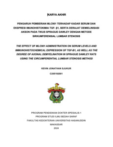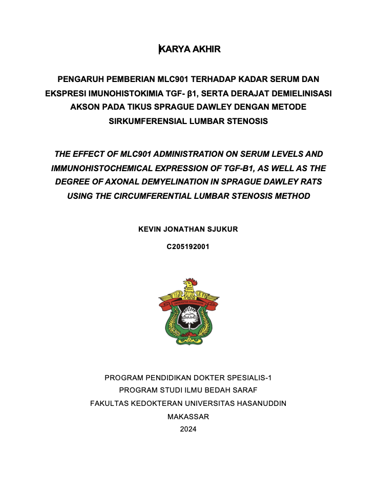 SJUKUR, KEVIN JONATHAN (2025) PENGARUH PEMBERIAN MLC901 TERHADAP KADAR SERUM DAN EKSPRESI IMUNOHISTOKIMIA TGF- β1, SERTA DERAJAT DEMIELINISASI AKSON PADA TIKUS SPRAGUE DAWLEY DENGAN METODE SIRKUMFERENSIAL LUMBAR STENOSIS = THE EFFECT OF MLC901 ADMINISTRATION ON SERUM LEVELS AND IMMUNOHISTOCHEMICAL EXPRESSION OF TGF-Β1, AS WELL AS THE DEGREE OF AXONAL DEMYELINATION IN SPRAGUE DAWLEY RATS USING THE CIRCUMFERENTIAL LUMBAR STENOSIS METHOD. Skripsi thesis, Universitas Hasanuddin.