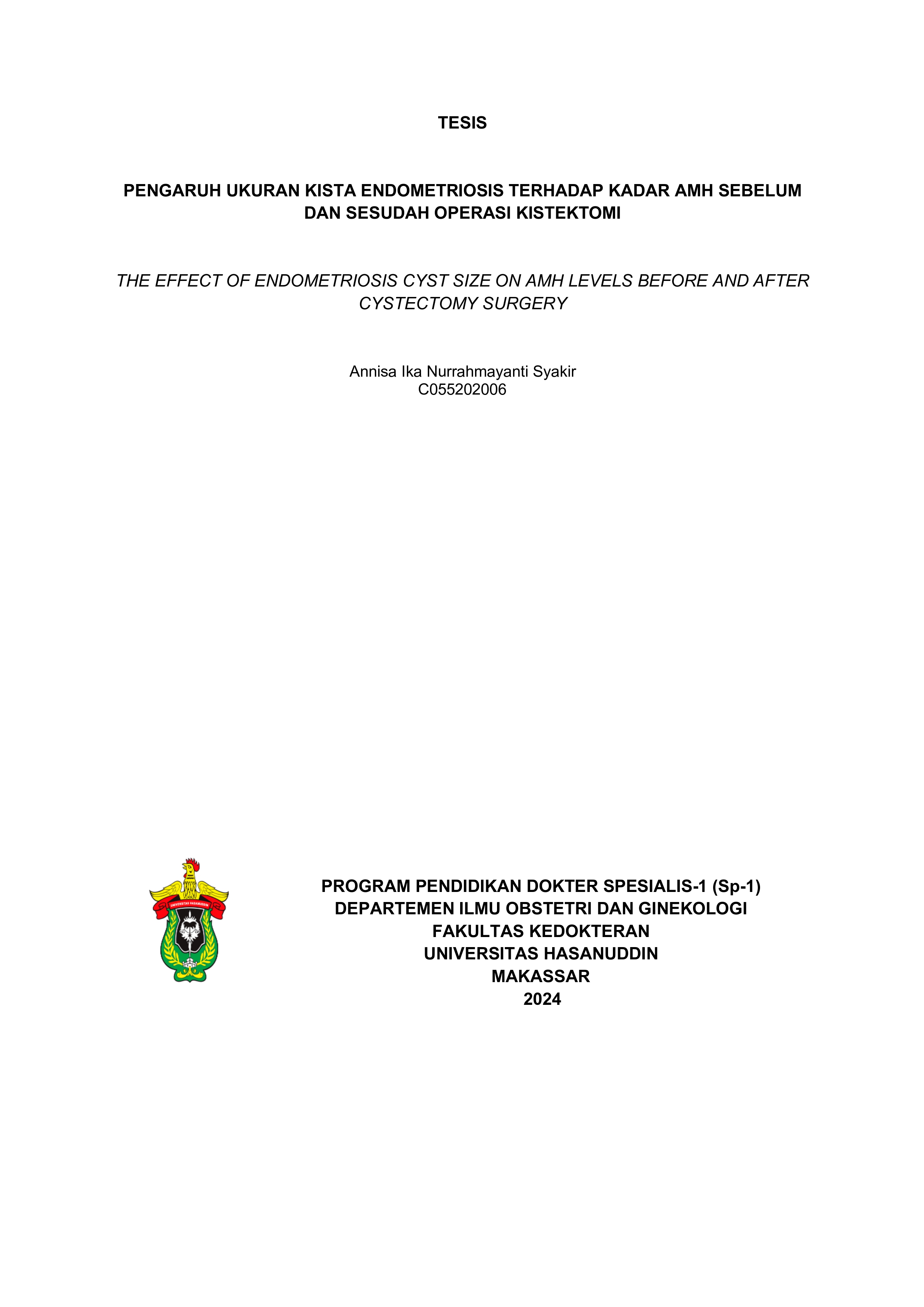 ANNISA IKA N. S. Pengaruh Ukuran Kista Endometriosis Terhadap Kadar AMH Sebelum Dan Sesudah Operasi Kistektomi. (dibimbing oleh Nusratuddin Abdullah, Elizabet C. Jusuf, Firdaus Hamid, Fatmawaty Madya, Samrichard Rambulangi). Endometrioma ovarium, umumnya disebut sebagai kista endometriosis, adalah kondisi ginekologi yang lazim terjadi pada wanita usia reproduksi. Kista ini dikaitkan dengan gejala-gejala seperti nyeri panggul, infertilitas, dan berkurangnya cadangan ovarium. Kistektomi adalah pengobatan pilihan untuk menangani kista endometriosis pada pasien infertilitas untuk meningkatkan angka kehamilan kumulatif; namun, tindakan ini diketahui dapat menyebabkan penurunan cadangan ovarium. Pengaruh kistektomi terhadap cadangan ovarium, khususnya yang diukur dengan kadar Anti-Müllerian Hormone (AMH), masih menjadi bahan perdebatan yang terus berlanjut, dengan faktor-faktor seperti ukuran kista dan lateralisasi yang berpotensi memengaruhi kadar AMH. Penelitian ini bertujuan untuk menyelidiki perbedaan kadar Anti-Müllerian Hormone (AMH) dan menilai dampak kistektomi ovarium, dengan fokus pada efek ukuran kista dan lateralisasi. Penelitian ini menggunakan desain kohort prospektif. Pengambilan sampel secara berurutan digunakan untuk memilih pasien berusia 19-35 tahun dengan kista endometriosis yang dikonfirmasi dengan USG. Sampel terdiri dari 46 wanita dengan kista endometriosis yang menjalani kistektomi unilateral atau bilateral. Semua peserta tidak pernah menjalani operasi ginekologi sebelumnya dan belum pernah menerima pengobatan kesuburan. Kadar AMH dinilai sebelum operasi dan satu bulan setelah operasi dengan menggunakan enzyme-linked immunosorbent assay (ELISA). Penelitian ini menemukan perbedaan yang signifikan dalam kadar AMH antara pengukuran sebelum dan sesudah operasi (p<0,05) pada pasien dengan kista endometriosis. Rata-rata penurunan AMH adalah 1,25 ng/ml. Penurunan kadar AMH lebih nyata pada kasus dengan kista bilateral (40,62%). Tidak ada hubungan yang signifikan antara ukuran kista dan kadar AMH (p>0,05) sebagai faktor risiko pada wanita dengan kista endometriosis. Kesimpulannya, kistektomi ovarium berdampak buruk pada cadangan ovarium, yang dibuktikan dengan penurunan kadar Anti-Mullerian Hormone (AMH) yang bersirkulasi pasca operasi. Prosedur kistektomi harus diputuskan dengan hati-hati karena AMH yang rendah menunjukkan berkurangnya harapan hidup reproduksi, terutama pada kasus bilateral.