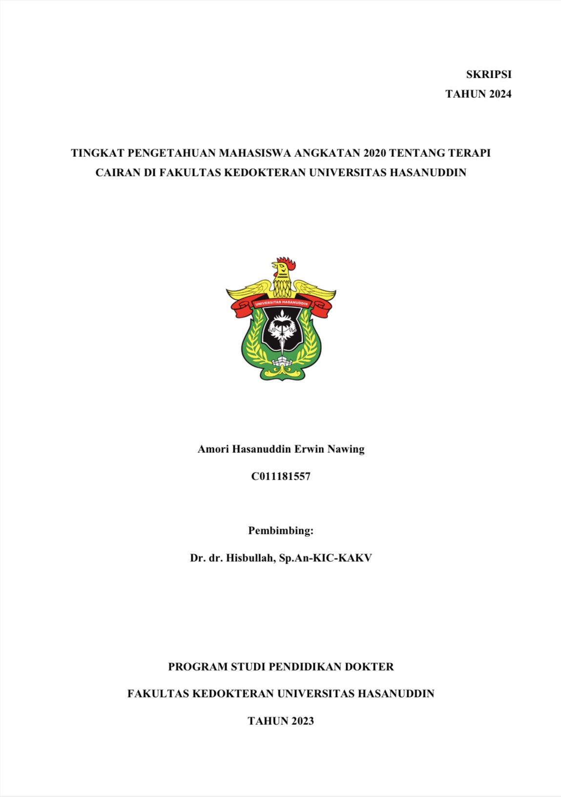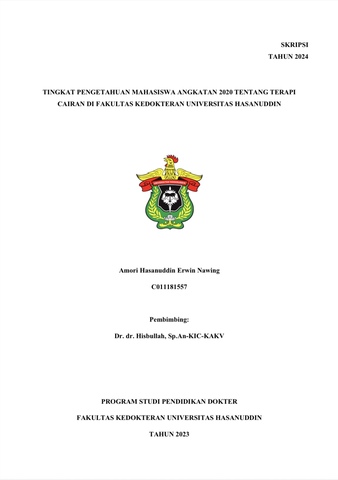 NAWING, AMORI HASANUDDIN ERWIN (2025) TINGKAT PENGETAHUAN MAHASISWA ANGKATAN 2020 TENTANG TERAPI CAIRAN DI FAKULTAS KEDOKTERAN UNIVERSITAS HASANUDDIN = 2020 STUDENTS' KNOWLEDGE LEVEL ABOUT FLUID THERAPY AT THE FACULTY OF MEDICINE, HASANUDDIN UNIVERSITY. Skripsi thesis, Universitas Hasanuddin.