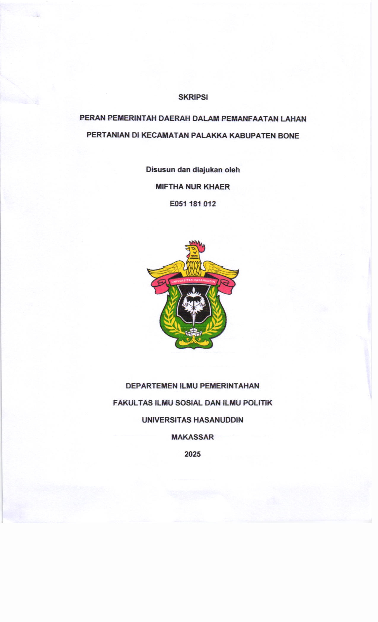 Miftha Nur Khaer, Nomor induk mahasiswa E051181012, Program Studi Ilmu Pemerintahan, Fakultas Ilmu Sosial dan Ilmu Politik, Universitas Hasanuddin Menyusun Skripsi dengan judul “Peran Pemerintah Daerah dalam Pemanfaatan Lahan Peranian di Kecamatan Palakka, Kabupaten Bone” , dibawah bimbingan Ibu Prof. Dr. Hj. Nurlinah. M.Si sebagai pembimbing I dan Bapak Dr. Suhardiman Syamsu, M.Si. sebagai pembimbing II. Penelitian ini bertujuan untuk mengetahui bagaimana peran Dinas pertanian Tanaman Pangan, Hortikultura, dan Perkebunan dalam penyedian sarana dan prasaran pertanian yang tercantum dalam peraturan daerah Kabupaten Bone Nomor 69 Tahun 2018 tentang Kedudukan, Susunan Organisasi, Tugas Dan Fungsi Serta Tata Kerja Dinas Pertanian Tanaman Pangan, Hortikultura Dan Perkebunan. Penelitian ini menggunakan metode kualitatif. Jenis data terdiri dari data primer yang diperoleh melalui wawancara dan observasi. Sedangkan data sekunder dari dokumen laporan dan peraturan-peraturan yang berkaitan dengan penyediaan sarana dan prasarana pertanian serta pengembangan potensi dan irigasi di Kecamatan Palakka, Kabupaten Bone. Hasil penelitian menunjukkan bahwa pemerintah daerah memiliki peran krusial dalam pemanfaatan lahan pertanian melalui berbagai program dan kebijakan, termasuk penyediaan sarana dan prasarana pertanian, penyuluhan dan pendampingan bagi petani, serta fasilitasi akses terhadap teknologi dan informasi pertanian. Namun, ditemukan beberapa kendala dalam implementasi peran tersebut, seperti keterbatasan anggaran, pembangunan sarana dan prasarana pertanian masih belum merata, dan tantangan dalam adaptasi petani terhadap inovasi pertanian.