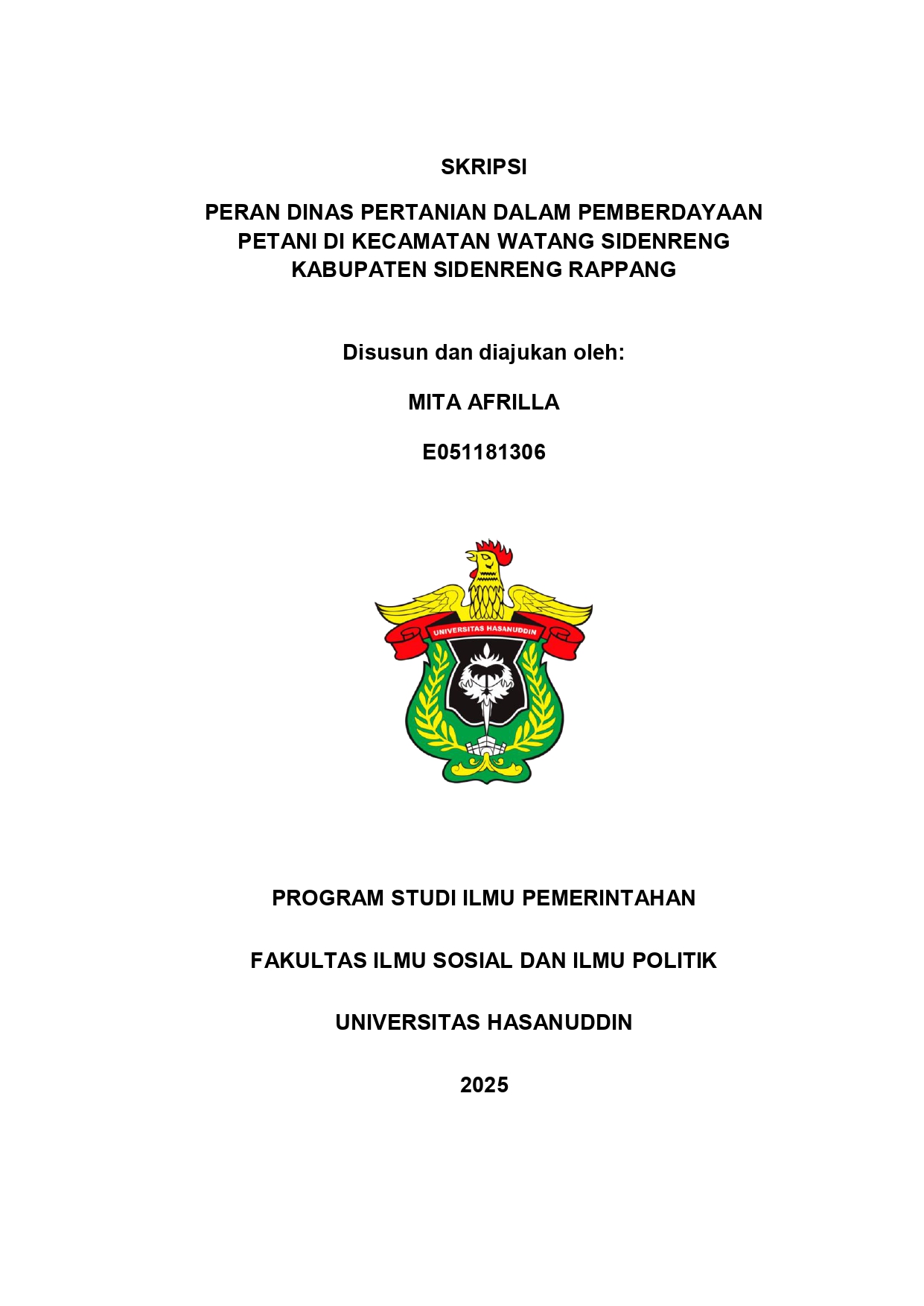 AFRILLA, MITA (2025) PERAN DINAS PERTANIAN DALAM PEMBERDAYAAN PETANI DI KECAMATAN WATANG SIDENRENG KABUPATEN SIDENRENG RAPPANG = The Role of the Agriculture Service in Empowering Farmers in Watang Sidenreng District, Sidenreng Rappang Regency. Skripsi thesis, UNIVERSITAS HASANUDDIN.