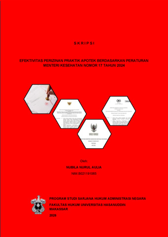 AULIA, NUBILA NURUL (2026) Efektivitas Perizinan Praktik Apotek Berdasarkan Peraturan Menteri Kesehatan Nomor 17 Tahun 2024 = The Effectiveness of Pharmacy Practice Licensing Based on the Regulation of the Minister of Health Number 17 of 2024. Skripsi thesis, UNIVERSITAS HASANUDDIN MAKASSAR.